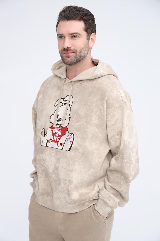 Представляем вашему вниманию стильное мужское худи от бренда Guess. Эта модель выполнена в приятном бежевом цвете и украшена ярким принтом с изображением кролика, что придает ей индивидуальность.