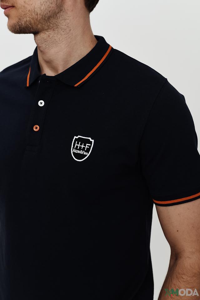 Мужское поло от бренда Haze and Finn выполнено в классическом стиле. Основной цвет – тёмно-синий, который дополнен яркой оранжевой отделкой по краю воротника, рукавов и нижней кромки. На левой стороне груди расположено небольшое белое лого в виде щита с аббревиатурой бренда.