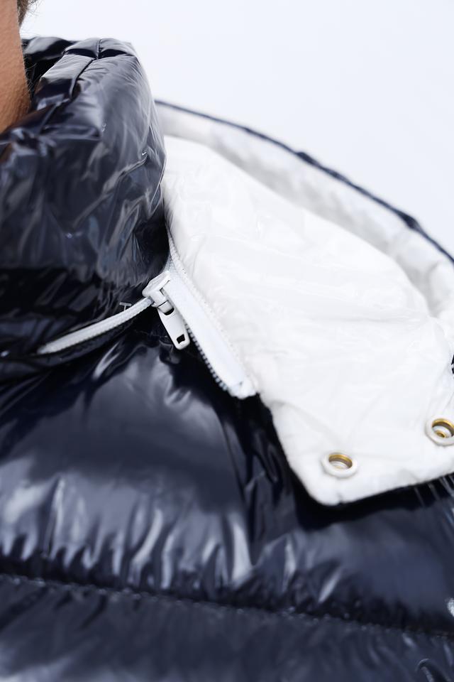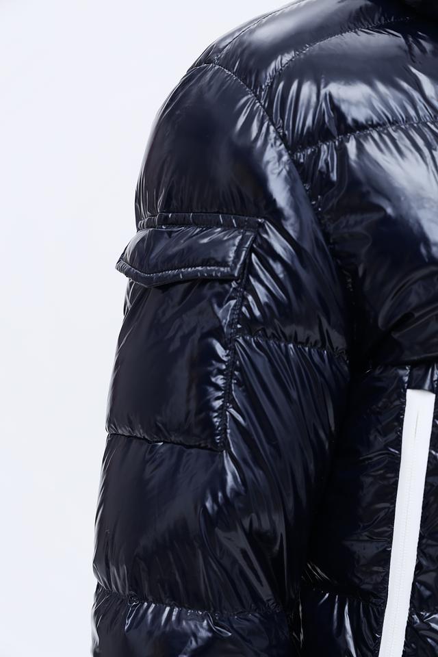 Модель имеет стеганую структуру, капюшон и удобную застежку-молнию. Белые полосы по бокам и на рукавах добавляют контраст и динамику. Куртка изготовлена из 100% полиамида, что обеспечивает легкость и устойчивость к влаге.