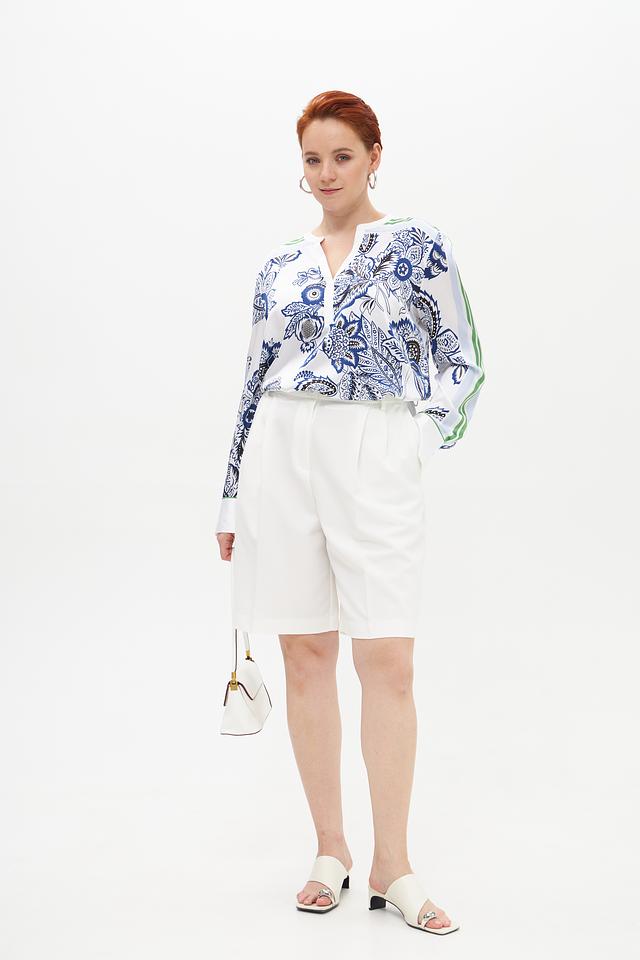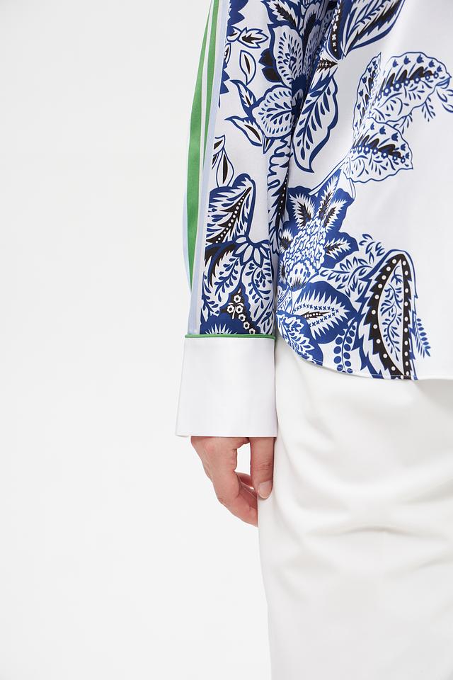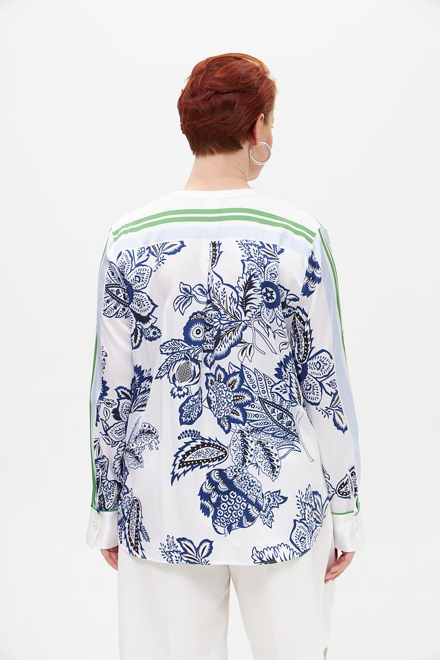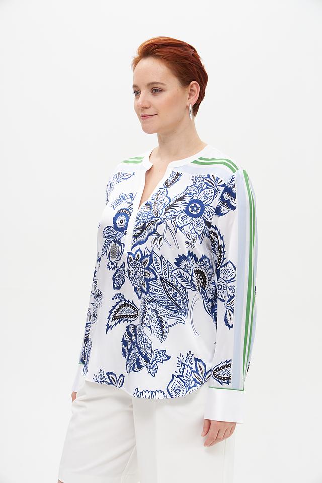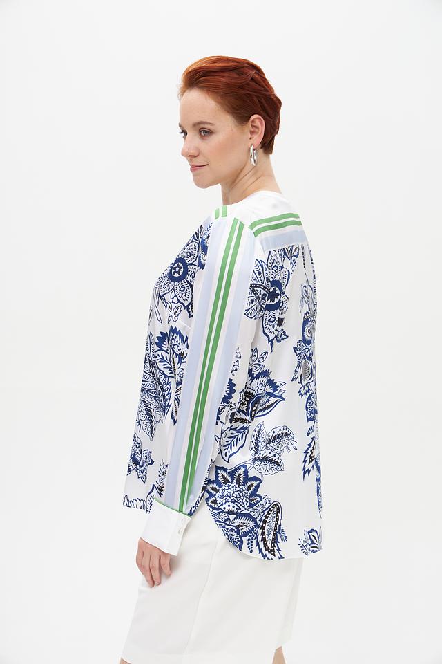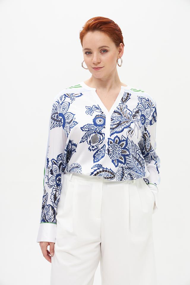 Основной цвет блузы – белый, украшенный ярким и детализированным цветочным принтом в синих и зеленых тонах. V-образный вырез подчеркивает женственность, а длинные рукава добавляют образу изысканности.