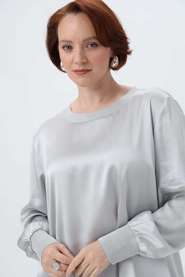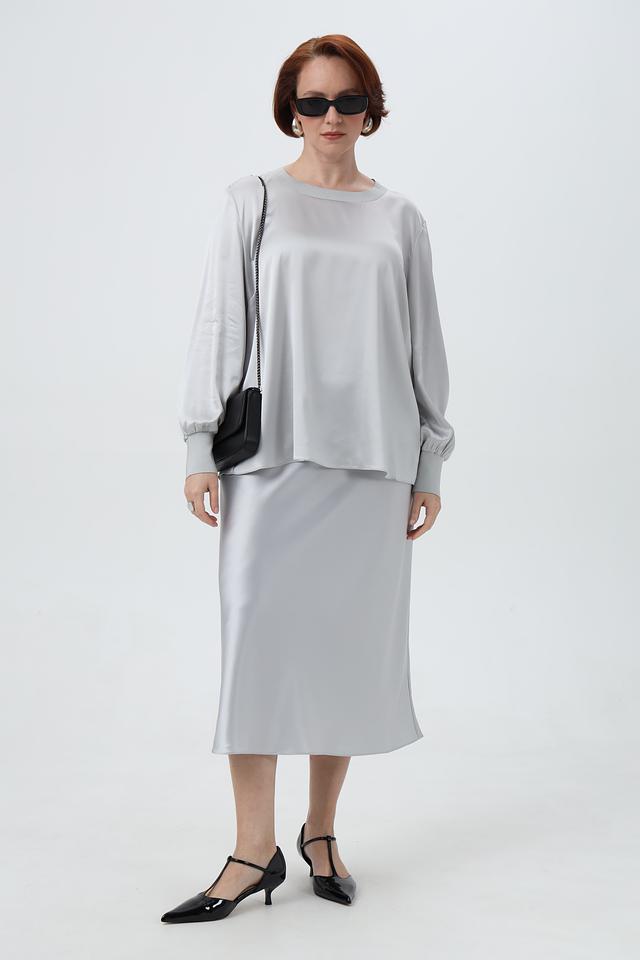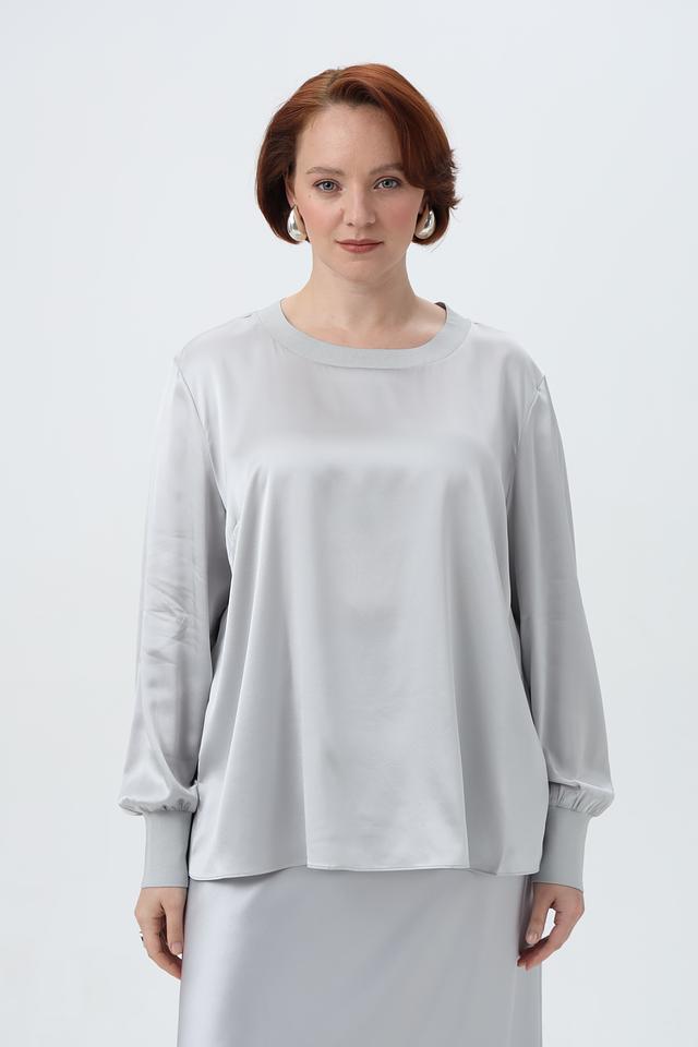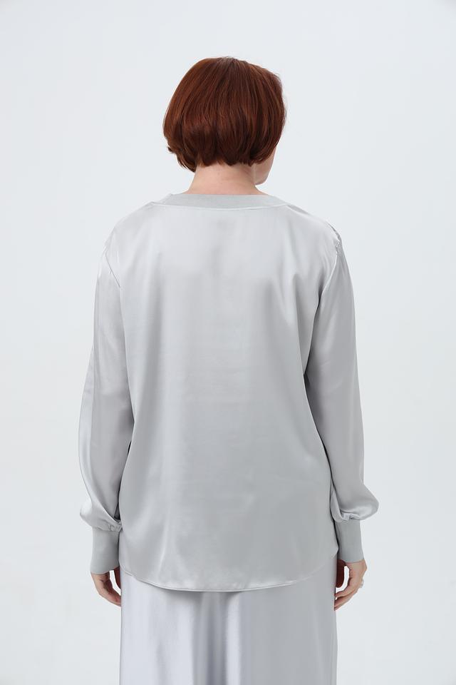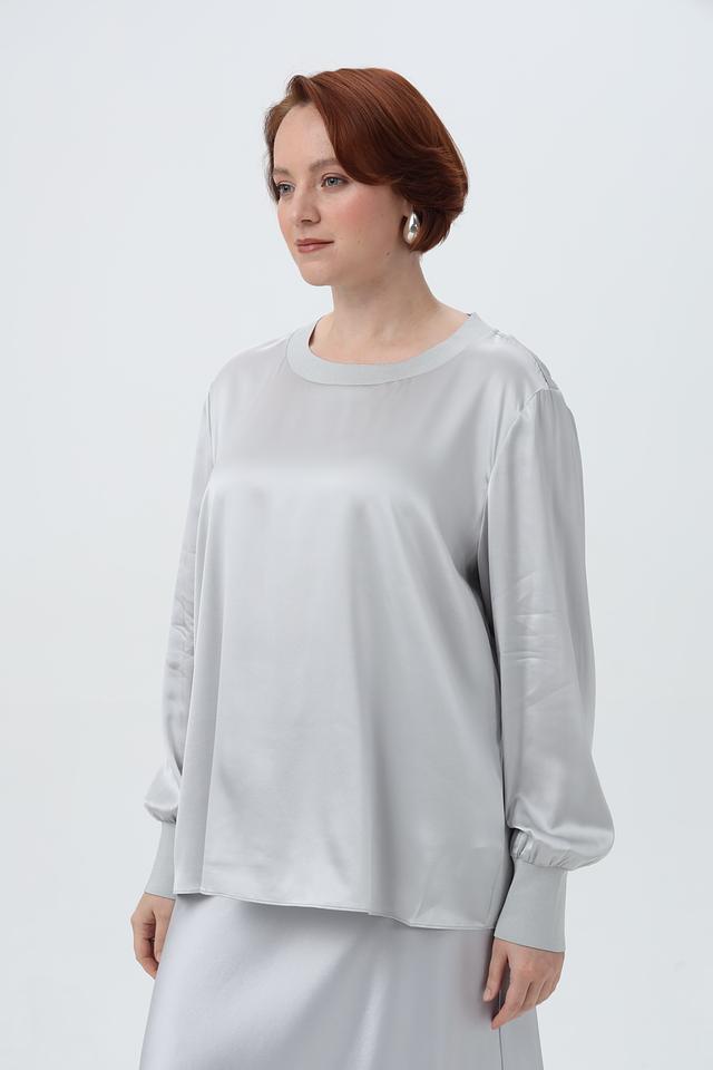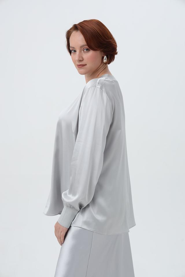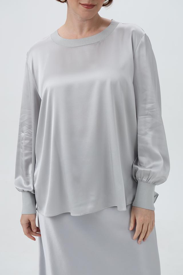 Стильная блузка Herzens Angelegenheit серого цвета выполнена из шелка с добавлением эластана. Модель имеет свободный крой, круглый вырез горловины и объемные рукава с манжетами. Состав: шелк 95%, эластан 5%