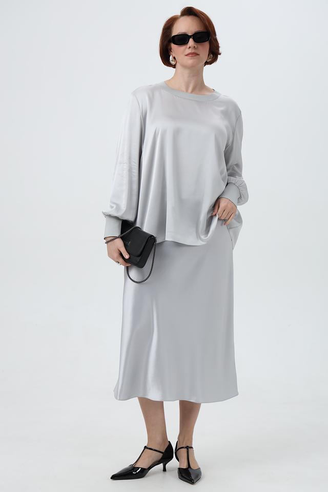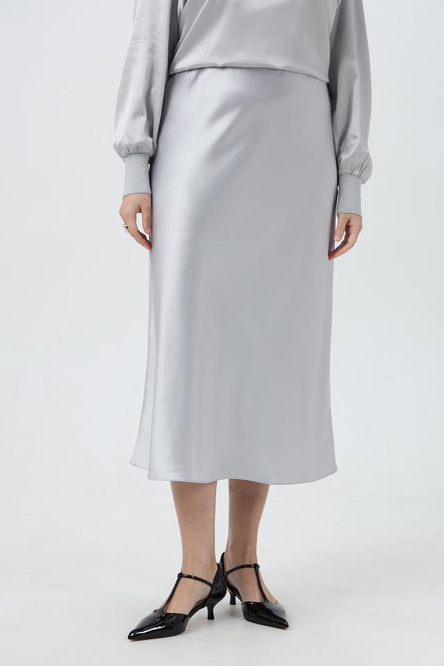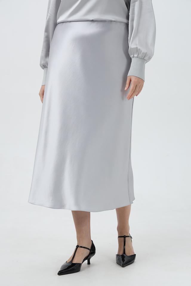 Модель выполнена из гладкого атласа серого цвета, который придает ей благородный вид. Прямой крой юбки обеспечивает комфортную посадку по фигуре, а миди-длина делает её подходящей для различных случаев.