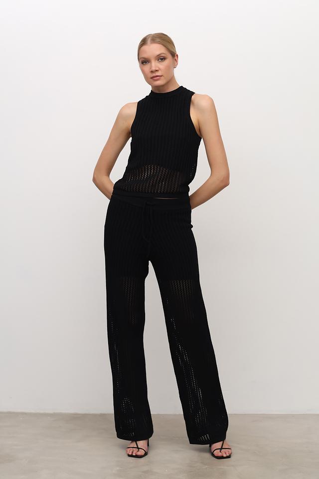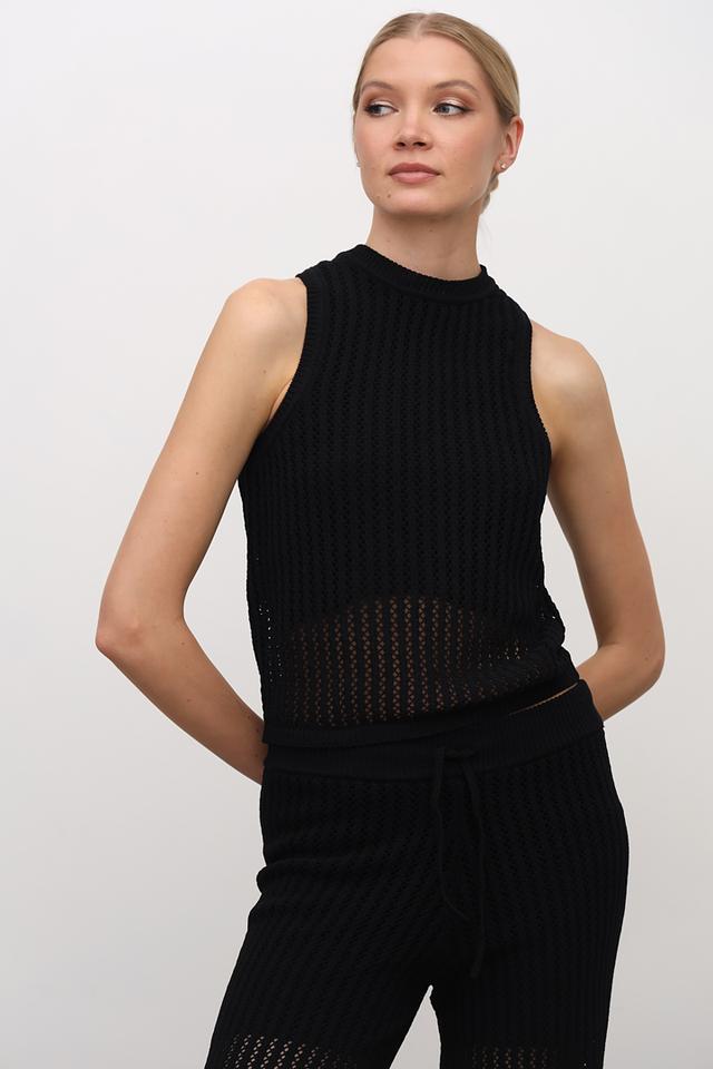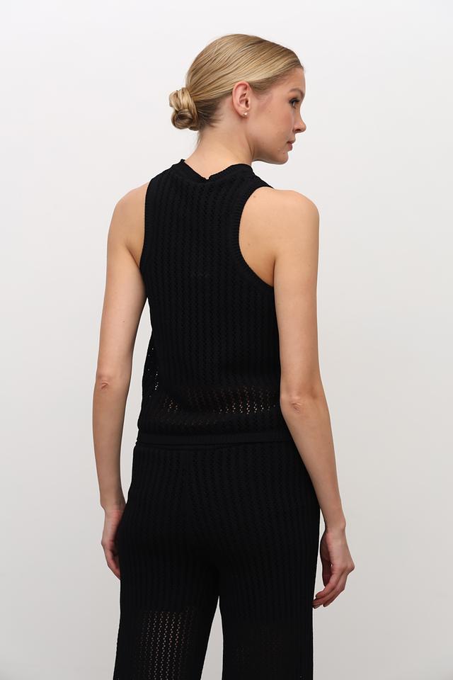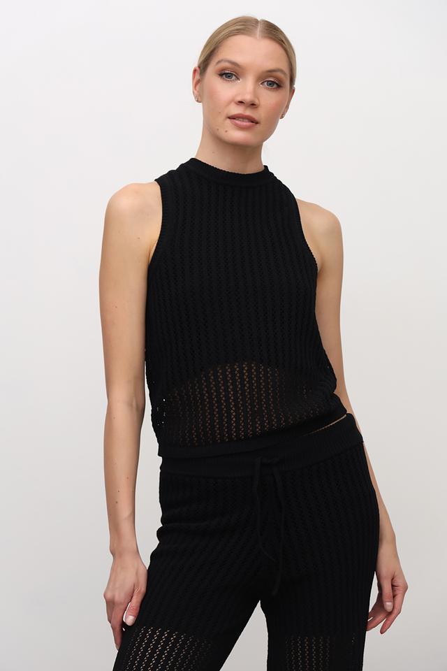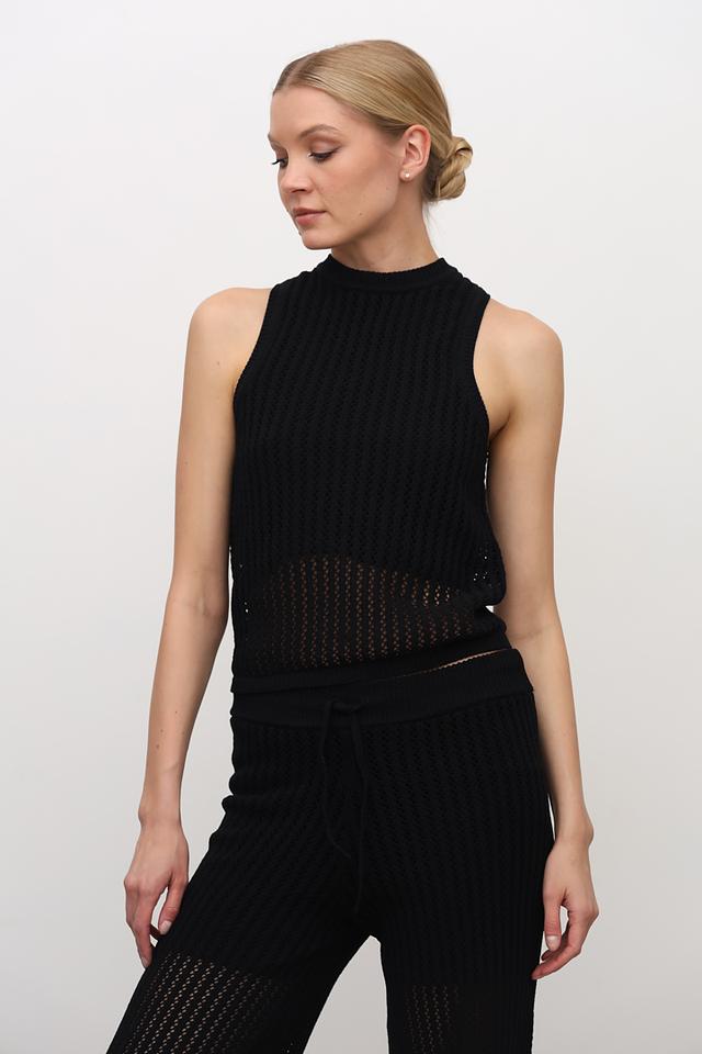Чёрный топ Hugo из фактурного трикотажа. Модель без рукавов с высоким воротом и ажурной вставкой. Состав: хлопок 72%, полиамид 28%. Состав: хлопок 72%, полиамид 28%