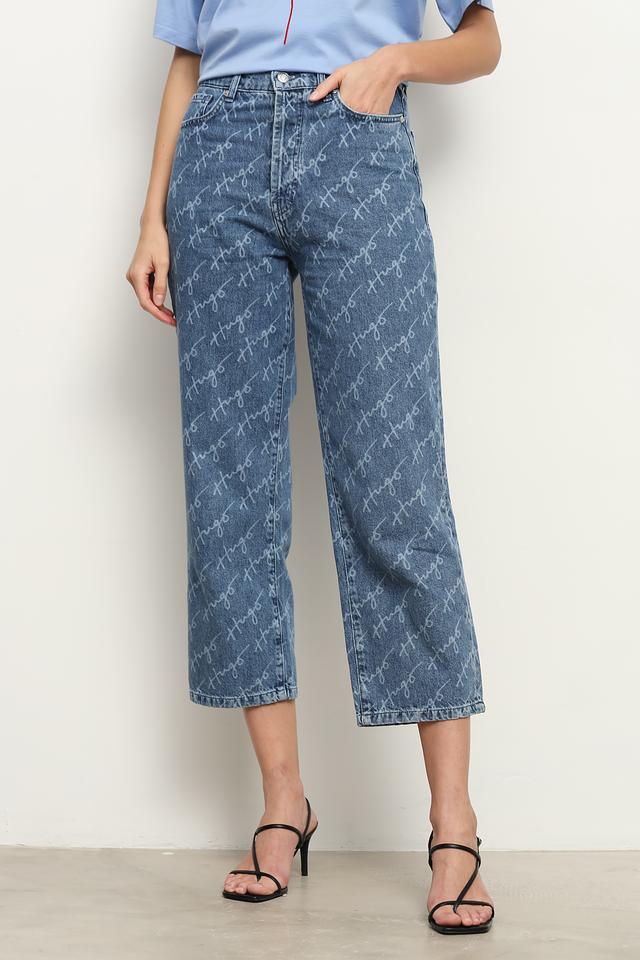 Джинсы имеют прямой крой и укороченную длину, что делает их идеальным выбором для создания модных образов. По всей поверхности ткани расположен повторяющийся логотип бренда, добавляющий изделию узнаваемость и оригинальность.