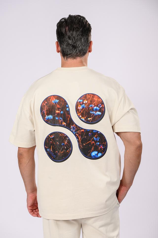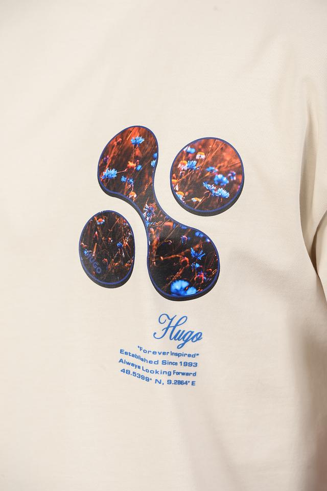 Бежевая футболка Hugo с оригинальным цветочным принтом на груди и спине. Изготовлена из 100% хлопка, обеспечивающего комфорт и воздухопроницаемость. Стильный и современный выбор для повседневного образа. Состав: хлопок 100%