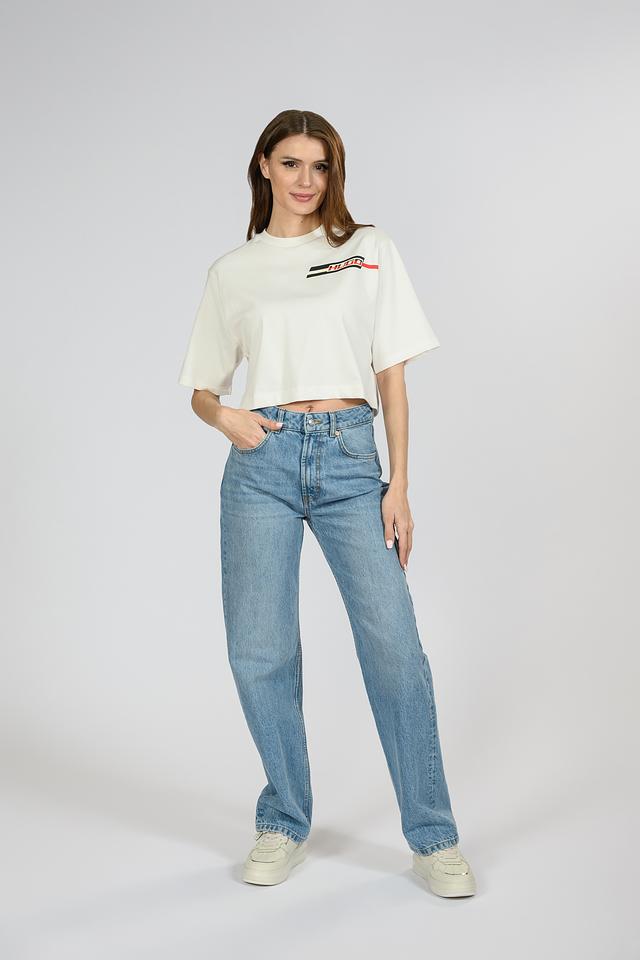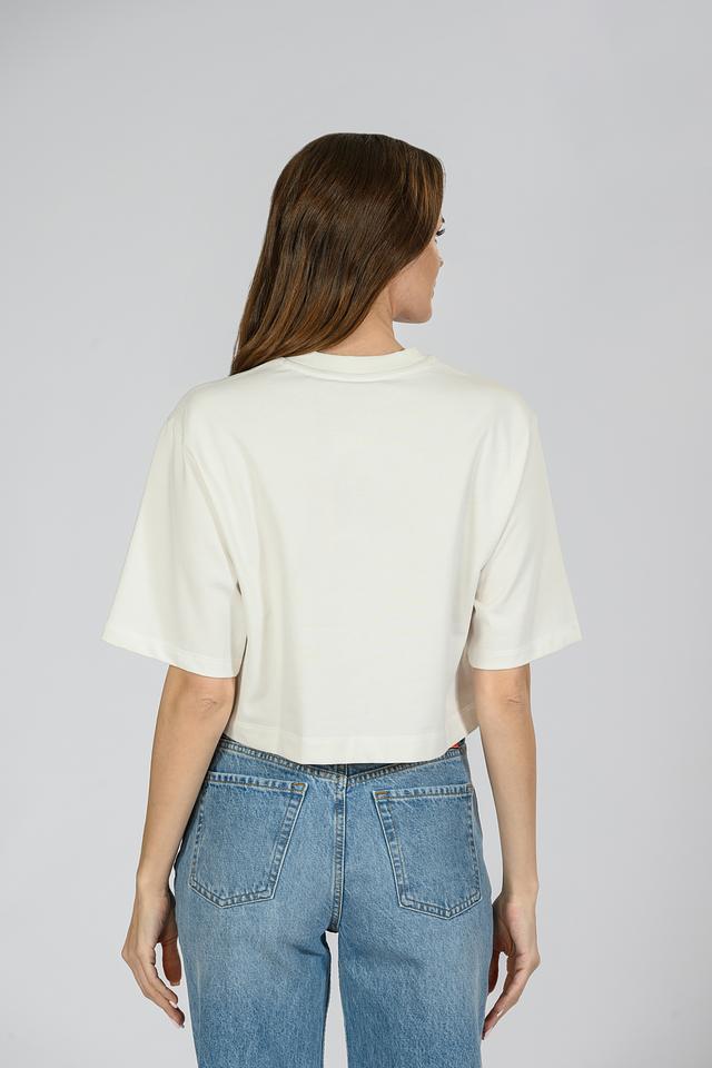 Модель имеет укороченный крой и короткие рукава, что придает ей современный и молодежный вид. На груди расположена яркая аппликация с логотипом бренда, выполненная в красных и черных тонах, что добавляет футболке индивидуальности.