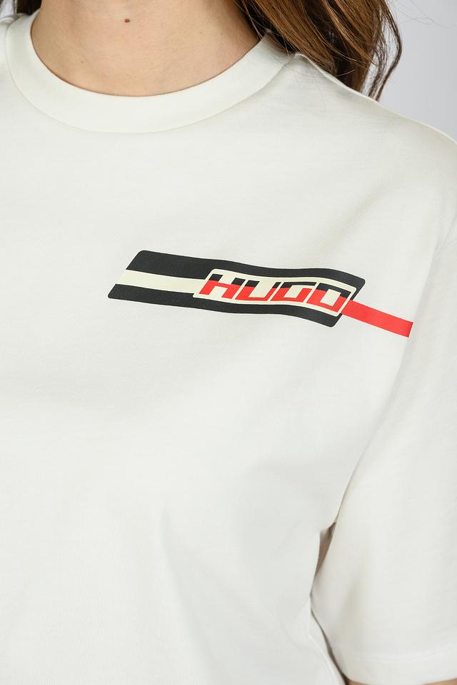 Женская футболка Hugo белого цвета с коротким рукавом и ярким логотипом на груди. Модель выполнена из 100% хлопка, обеспечивая комфорт и воздухопроницаемость. Состав: хлопок 100%