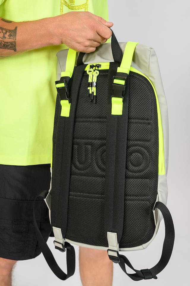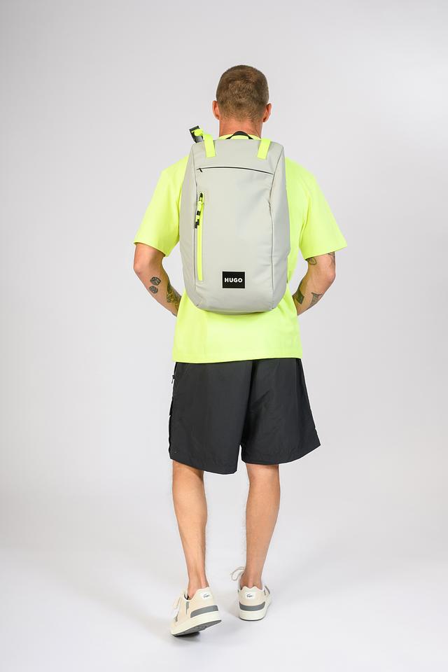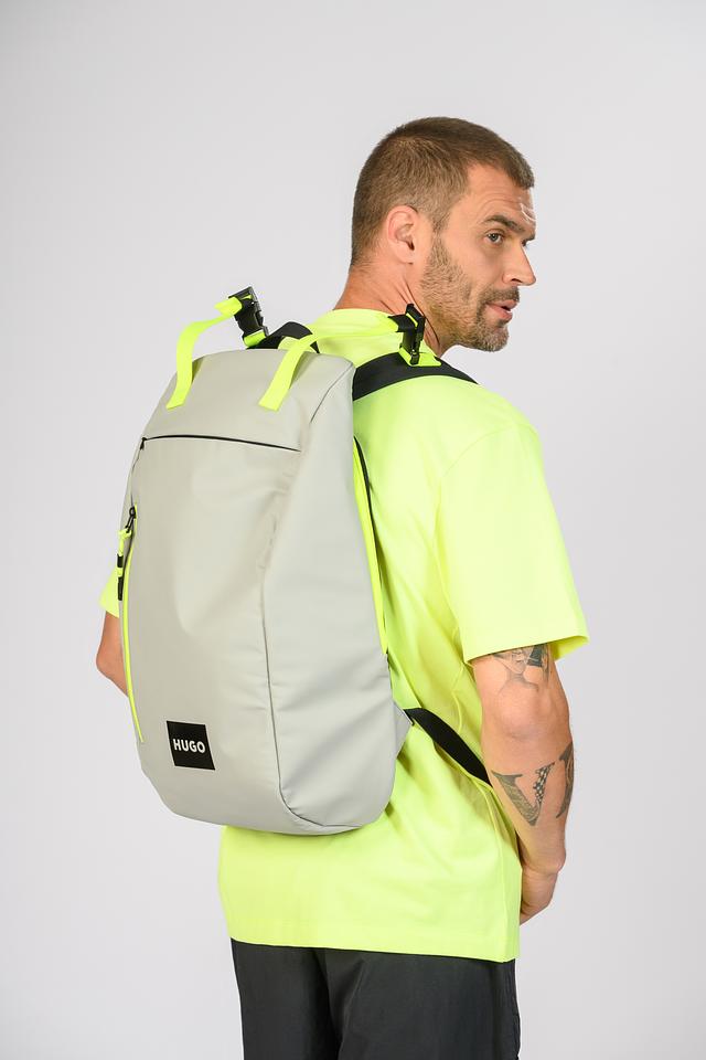 Дизайн рюкзака лаконичный и минималистичный, с акцентом на функциональность. Неоновые жёлтые элементы – лямки, молнии и петли – добавляют образу динамичности и современности. Логотип HUGO на передней панели подчеркивает принадлежность к бренду.