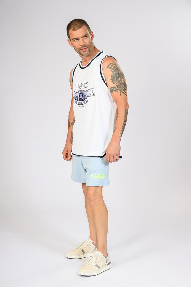 Белая футболка Hugo из 100% полиэстера с эффектным принтом на груди. Модель выполнена в баскетбольном стиле с широкими вырезами и контрастной отделкой. Идеальный выбор для активного образа жизни. Состав: полиэстер 100%