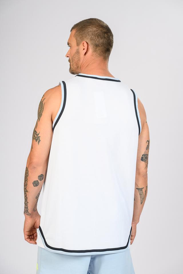 Дизайн футболки выполнен в спортивном стиле, вдохновленном баскетбольной формой. Широкие вырезы на рукавах и по бокам обеспечивают свободу движений, а контрастная черная и голубая отделка добавляет динамичности образу.