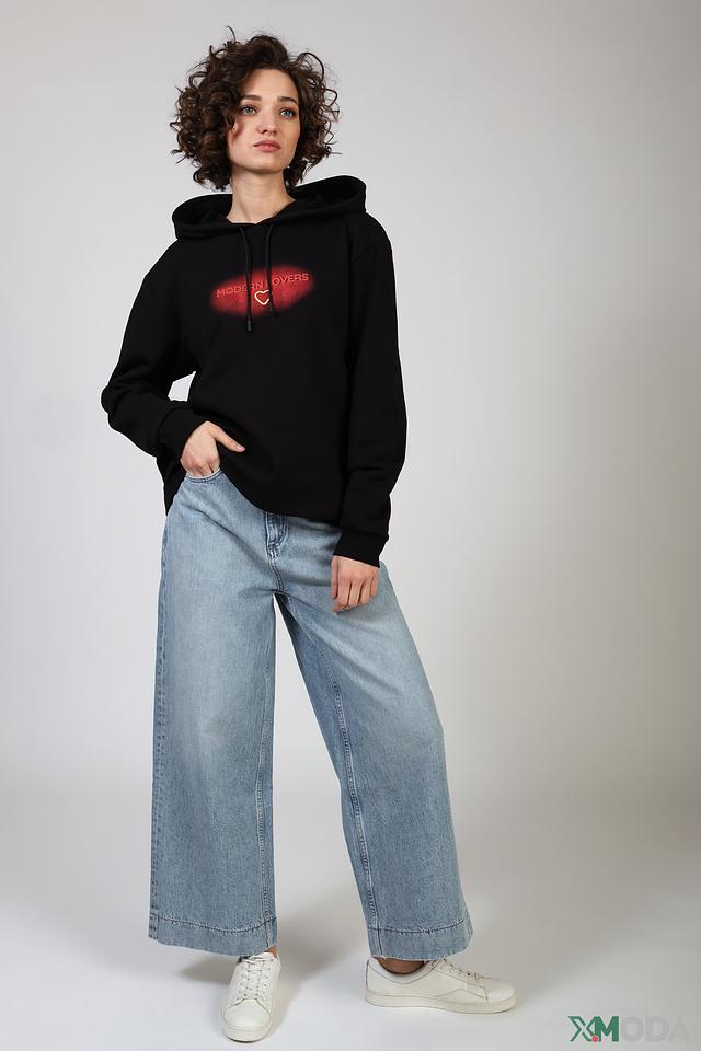 Модель имеет свободный крой, капюшон и длинные рукава с манжетами. Главной особенностью худи является яркий принт "Modern Lovers", выполненный в красных тонах, который добавляет образу индивидуальности и стиля.