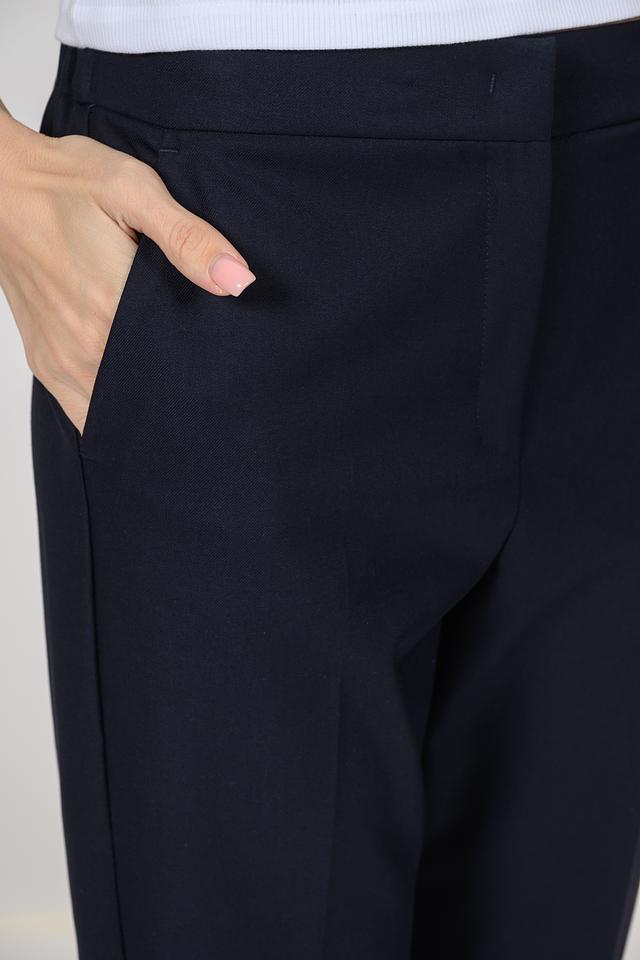 Брюки имеют стандартную длину и слегка зауженный силуэт к низу. Застёжка – молния и пуговица. Предусмотрены боковые карманы. Ткань состоит из полиэстера, вискозы и эластана, что обеспечивает приятные тактильные ощущения и хорошую износостойкость.