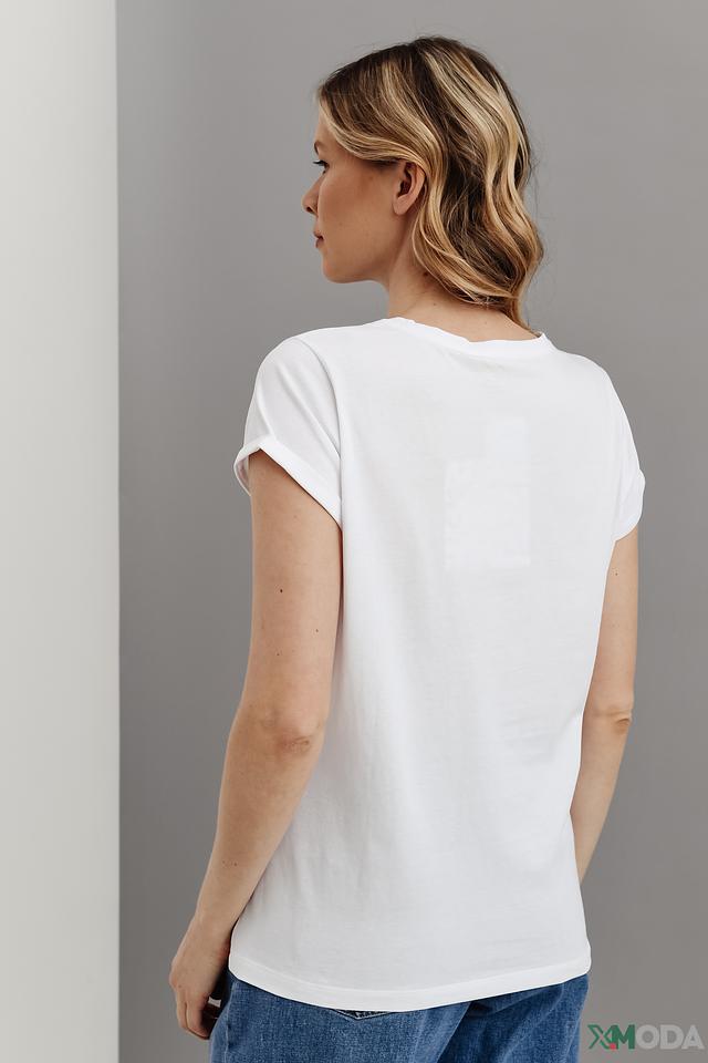 Футболка имеет прямой крой и короткие рукава с манжетами, которые можно закатать или оставить в классическом виде. Округлый вырез горловины подчеркивает естественность образа. Ткань приятна на ощупь и хорошо держит форму.