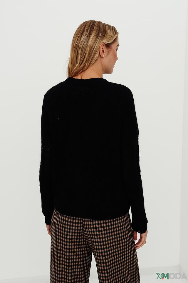 Чёрный кардиган i Blues из мягкой пряжи с округлым вырезом и застёжкой на пуговицы. Модель имеет свободный крой и рукава средней длины, идеально подходит для создания уютных и стильных образов. Состав: акрил 36%, нейлон 28%, мохер 18%, альпака 18%