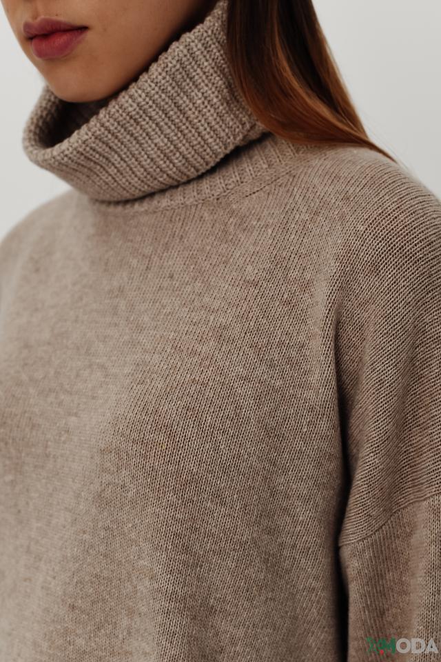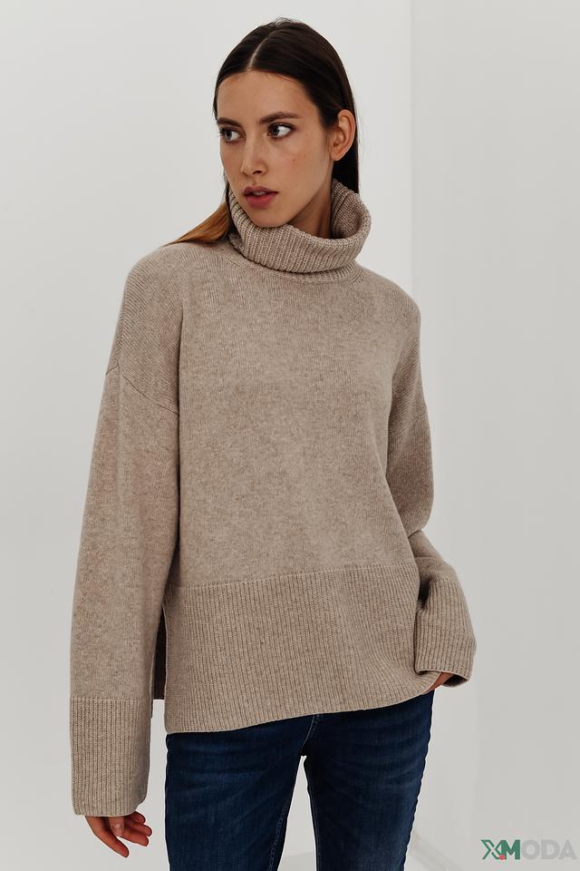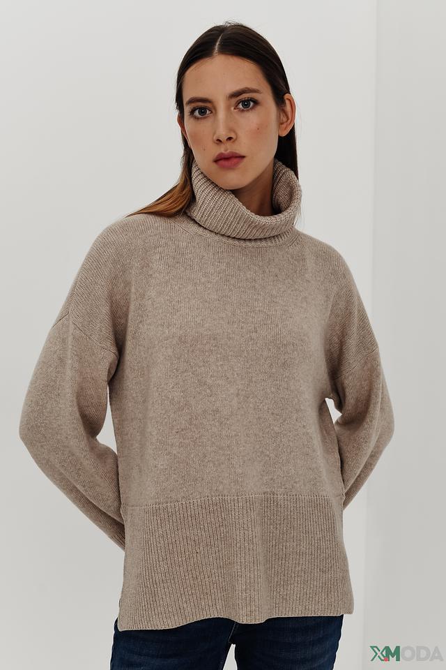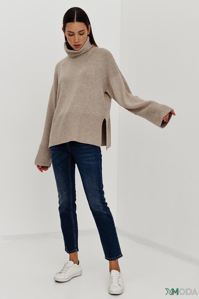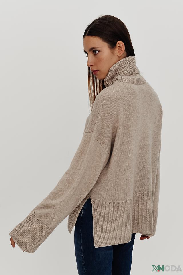 Джемпер имеет высокий горл, который защищает от холода и придает образу элегантность. Разрезы по бокам добавляют оригинальности и позволяют создать более динамичный силуэт.