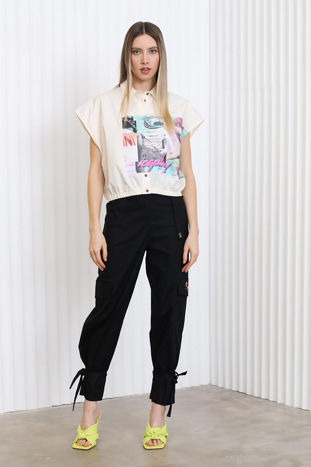 Блуза имеет укороченный крой и свободный силуэт, что делает ее удобной и универсальной. Особенностью модели является яркий принт с коллажем из изображений в стиле поп-арт, который добавляет ей оригинальности и динамики.