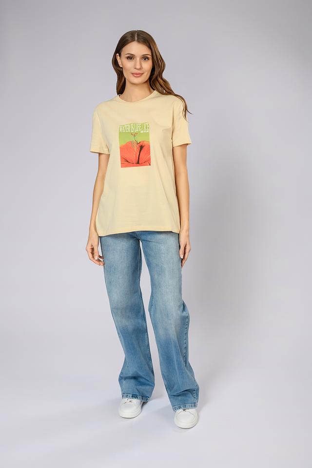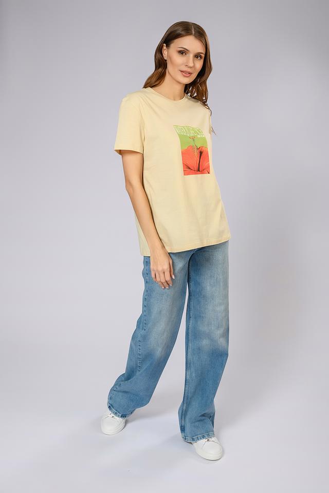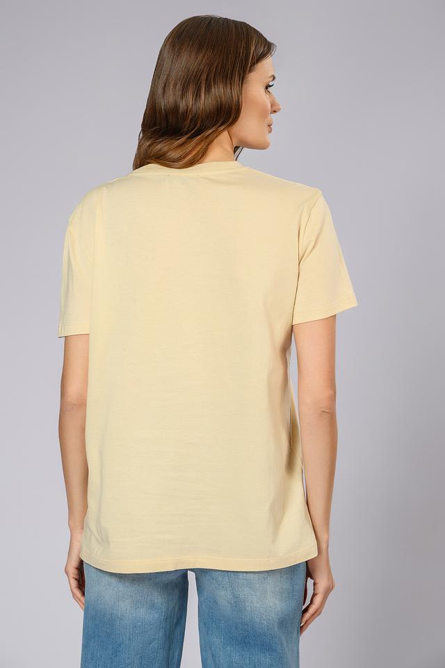 Цвет футболки – светло-жёлтый, который отлично сочетается с различными оттенками джинсовой ткани и другими цветами. Это универсальная вещь, которую можно носить как самостоятельно, так и в сочетании с другими элементами одежды.