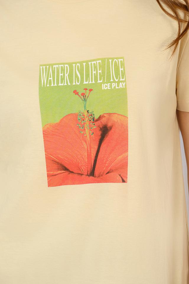 Женская футболка Ice Play светло-жёлтого цвета с ярким цветочным принтом. Изготовлена из 100% хлопка, обеспечивающего комфорт и воздухопроницаемость. Стильный и удобный вариант для повседневного образа. Состав:
