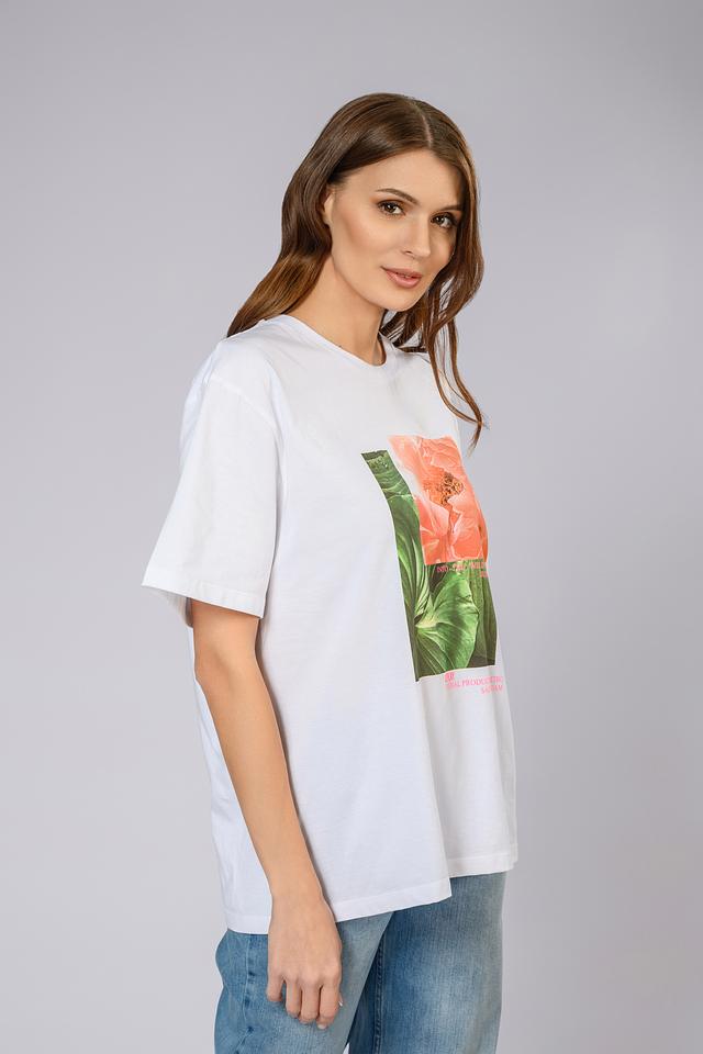 Особенностью данной модели является яркий цветочный принт на лицевой стороне, который придает ей оригинальность и выразительность. Футболка имеет свободный крой, что делает ее удобной в носке и позволяет создавать различные образы.