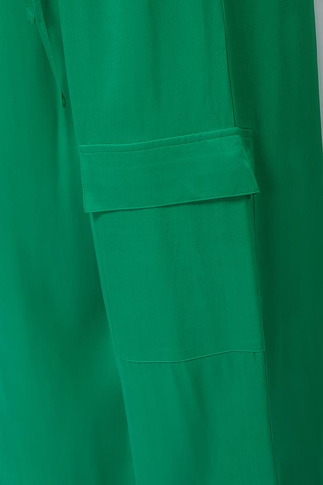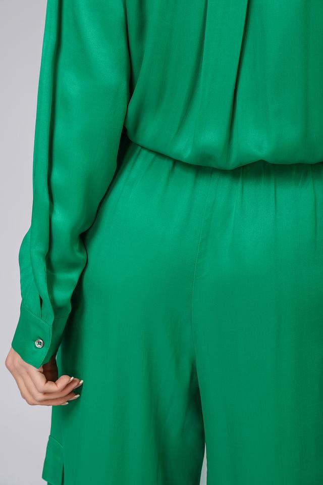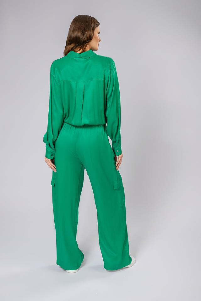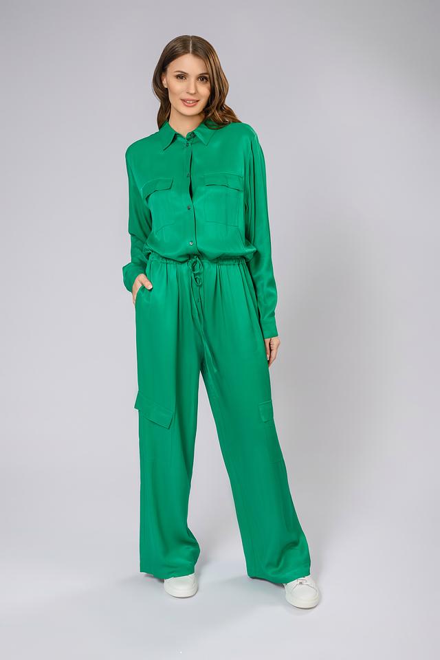 Модель дополнена двумя функциональными карманами на груди и двумя боковыми карманами. Длинные рукава с манжетами застегиваются на пуговицы. Широкие брючины создают элегантный и современный образ.