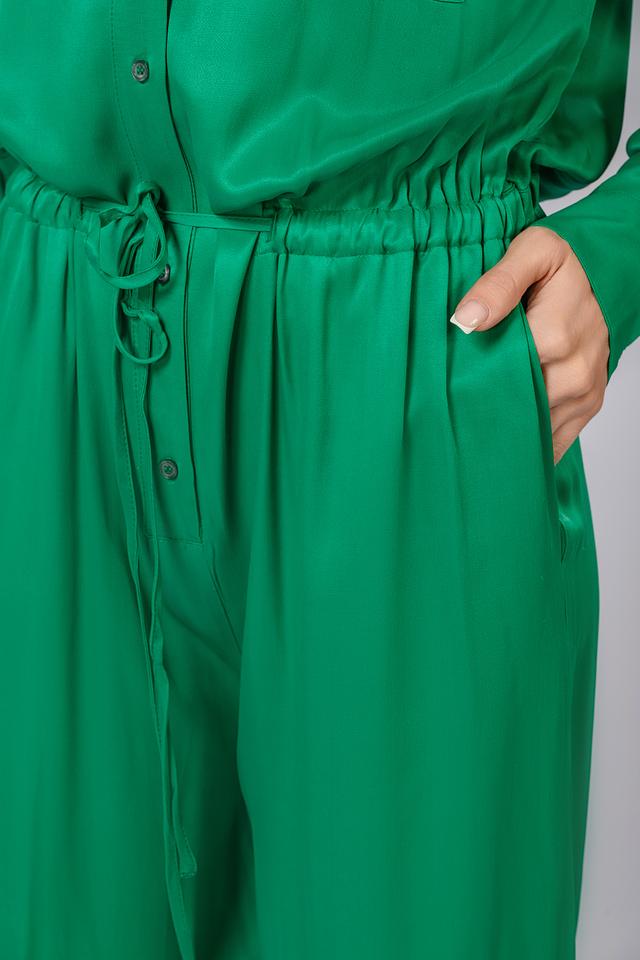 Комбинезон имеет рубашечный крой с отложным воротником и застежкой на пуговицы. Свободный силуэт не сковывает движений, а эластичная резинка на талии с кулиской позволяет регулировать посадку по фигуре.
