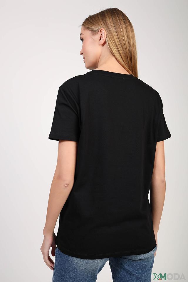 Особенностью данной модели является крупный логотип бренда, выполненный в серебристом цвете. Этот элемент придает футболке современный и узнаваемый вид. Футболка идеально сочетается с джинсами, шортами или юбками, создавая непринужденный и стильный образ.