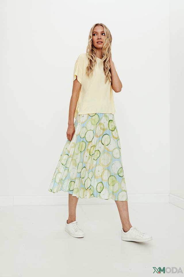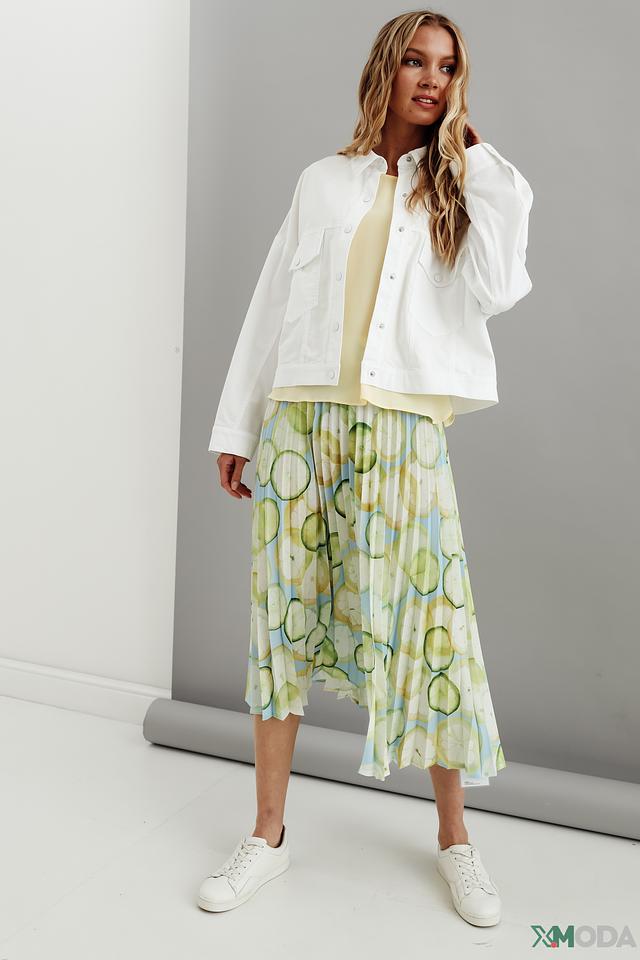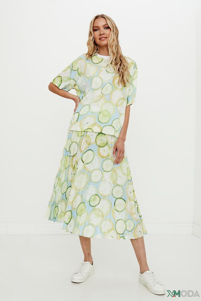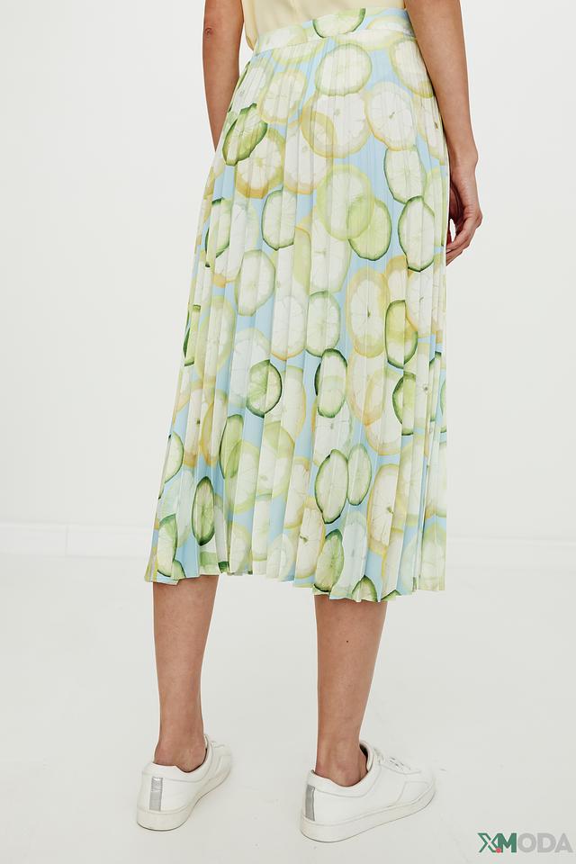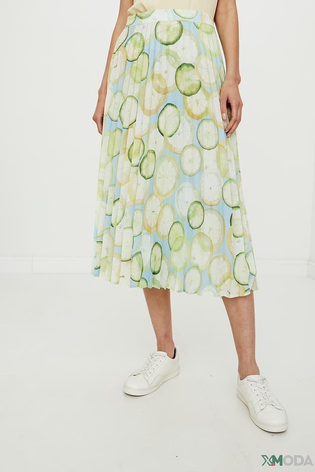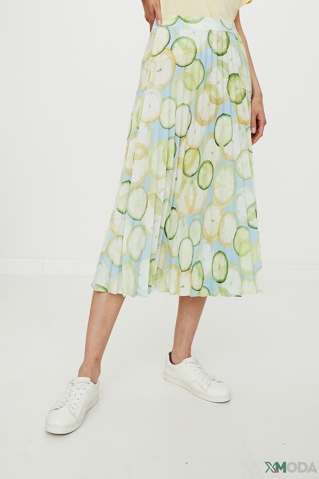 Юбка имеет плиссированную фактуру и длину миди, что придает ей элегантность и женственность. Главная особенность этой модели – яркий принт в виде огурцов, который добавит игривости и оригинальности вашему гардеробу.