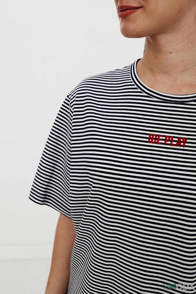 Женская футболка Ice Play в классическую сине-белую полоску. Модель свободного кроя с короткими рукавами и округлым вырезом горловины выполнена из 100% хлопка, обеспечивая комфорт в носке. Состав: хлопок 100%