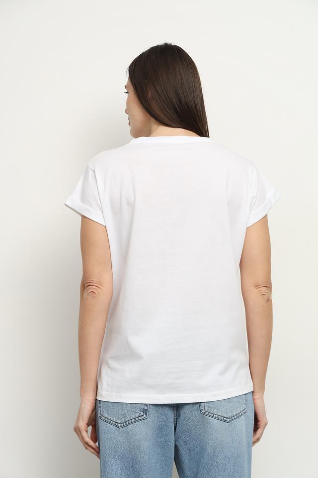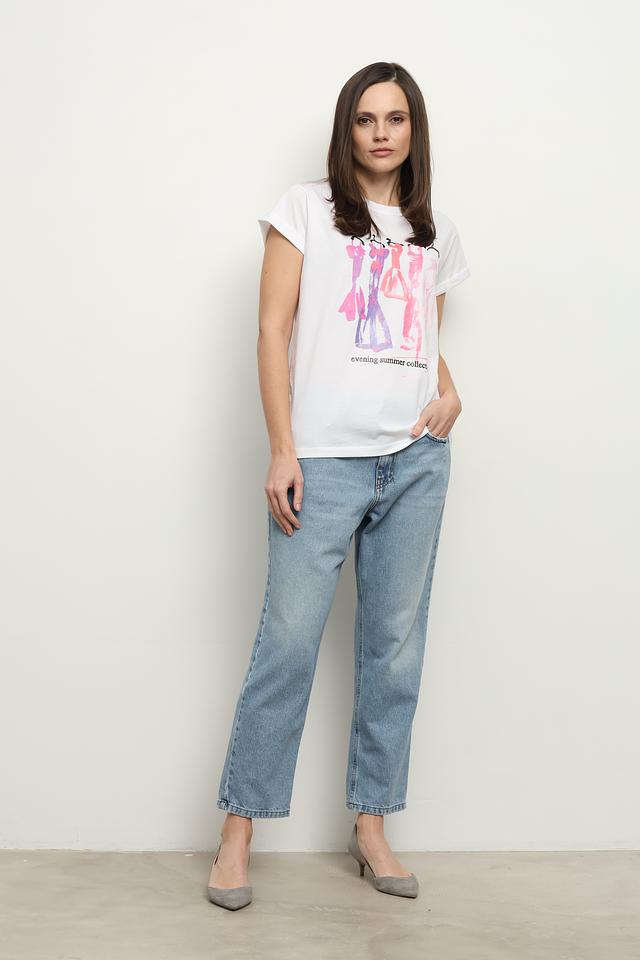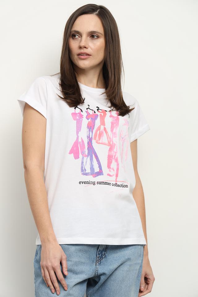 Женская футболка Icona белого цвета с ярким принтом в стиле летней коллекции. Изготовлена из 100% хлопка, обеспечивающего комфорт и воздухопроницаемость. Стильный и удобный вариант для повседневного образа. Состав: хлопок 100%