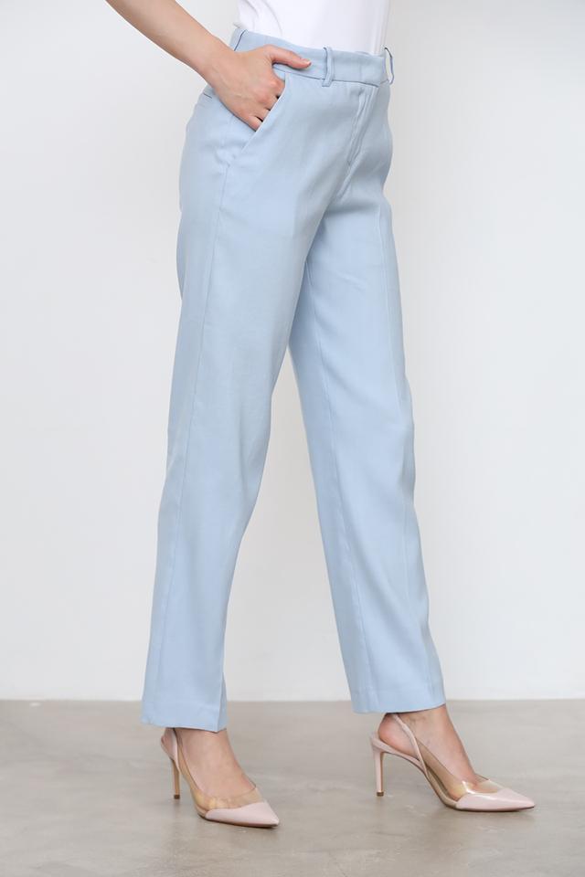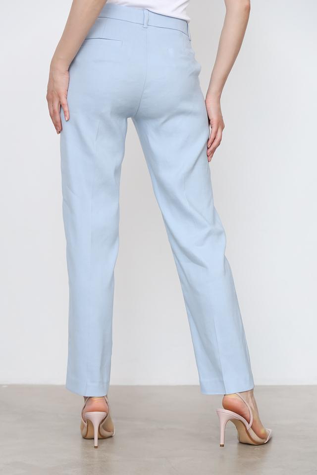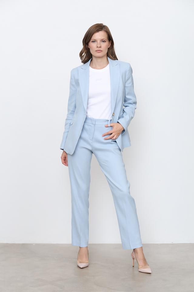 Брюки имеют стандартную посадку на талии, застежку на молнию и пуговицу, а также боковые карманы. Ткань состоит из 60% льна, 39% вискозы и 1% эластана, что обеспечивает легкость, воздухопроницаемость и небольшой процент эластичности для большего комфорта.