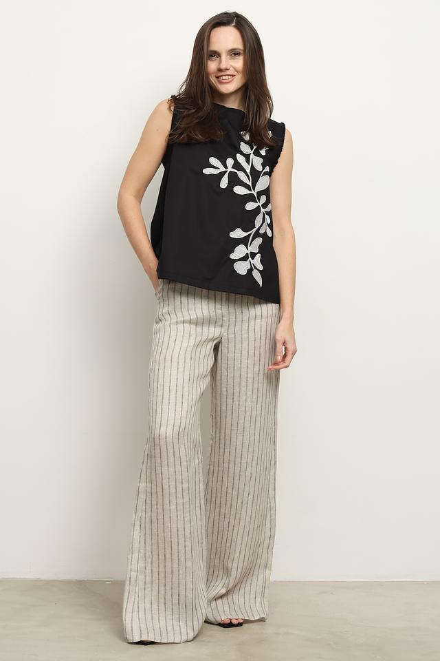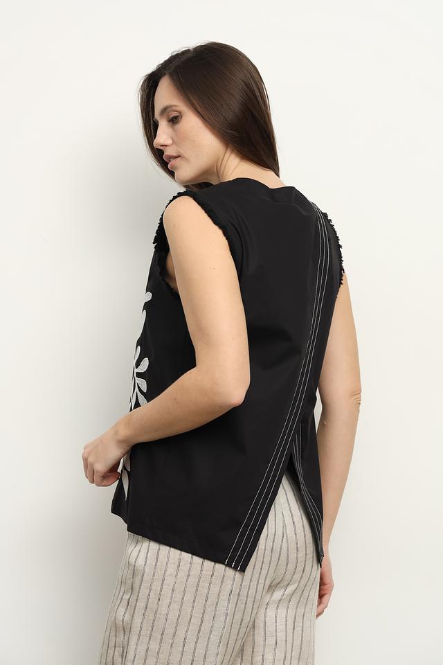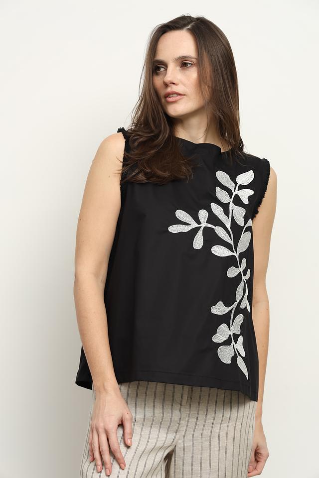 Чёрная блуза Icona с цветочной вышивкой – стильный выбор для создания элегантного образа. Модель без рукавов с декоративной отделкой горловины и асимметричным кроем спинки. Состав: хлопок 100%