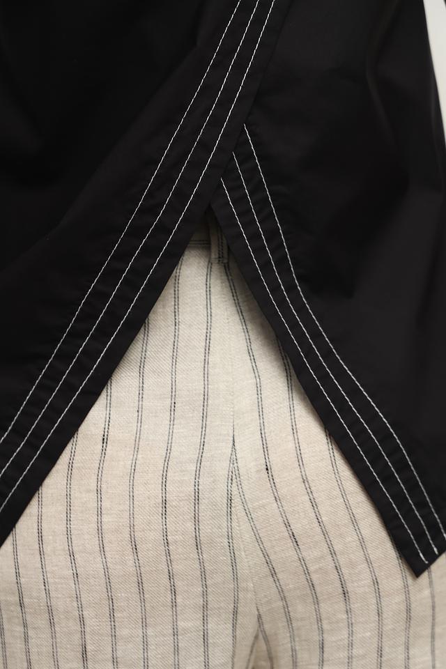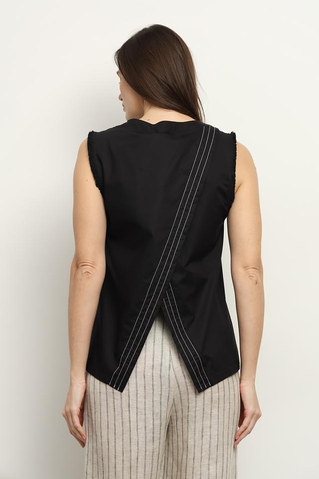 Блуза имеет свободный крой, который обеспечивает комфорт в носке. Отсутствие рукавов делает ее идеальным выбором для теплой погоды. Особый акцент сделан на декоративной отделке горловины и асимметричном крое спинки с контрастной отделкой.