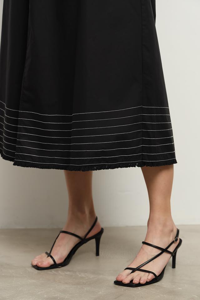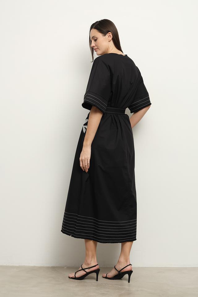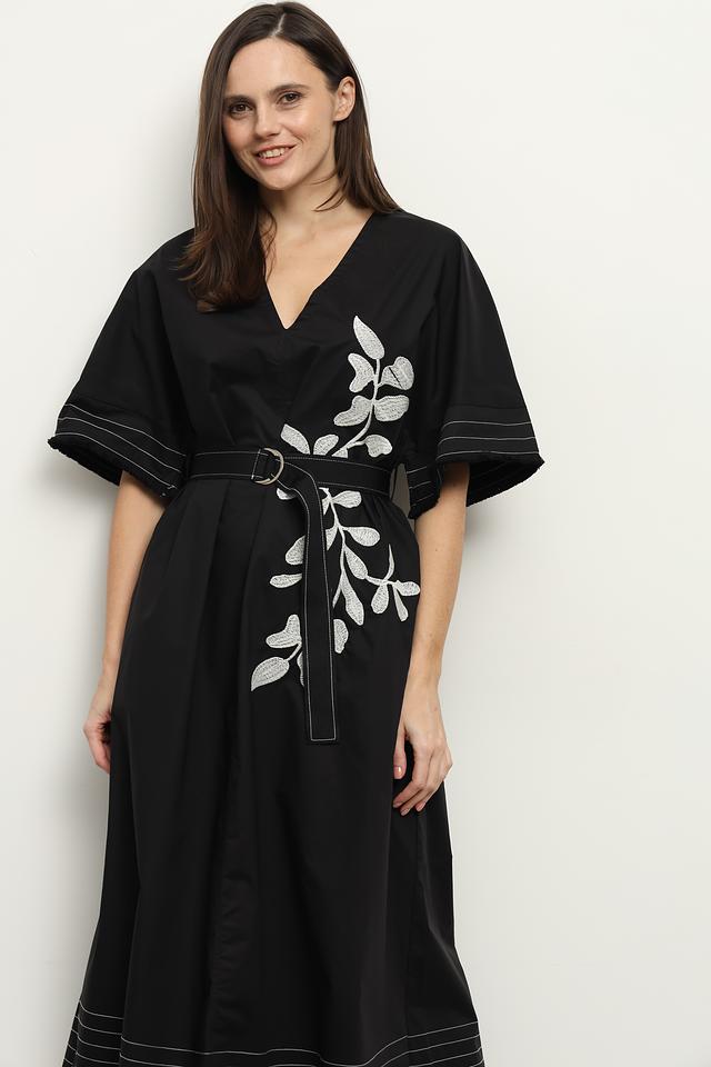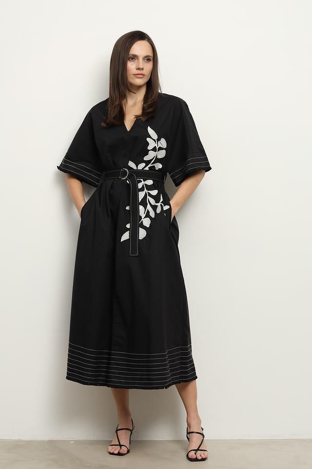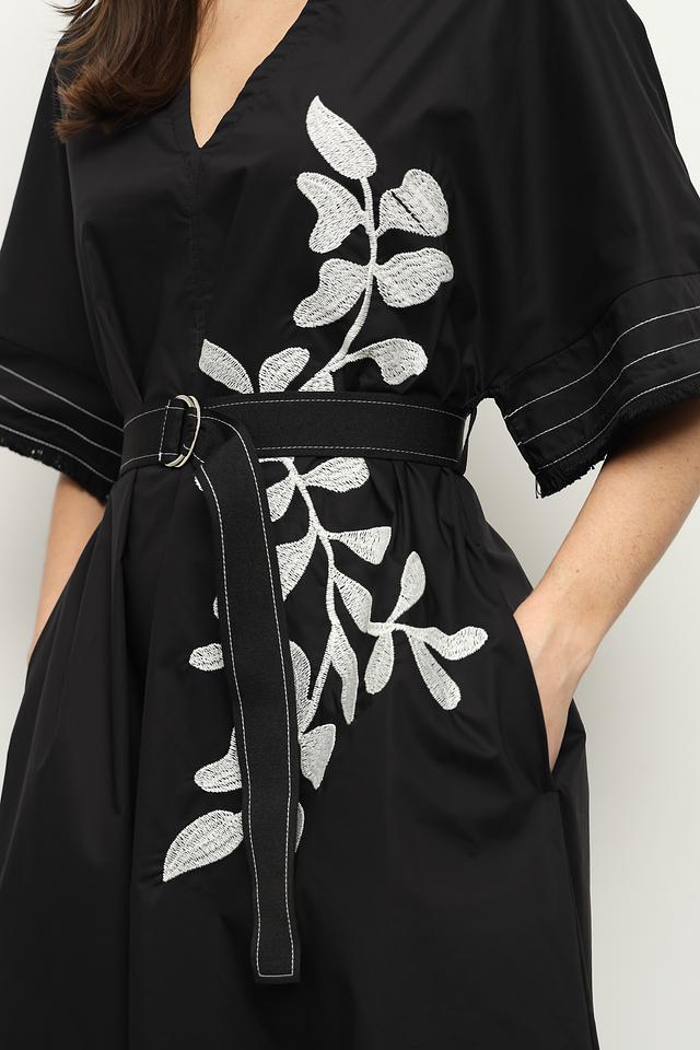 Чёрное платье от Icona из 100% хлопка, украшенное вышивкой в виде ветвей. Модель имеет свободный крой, V-образный вырез и пояс, подчеркивающий талию. Состав: хлопок 100%