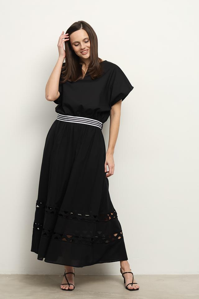 Блуза имеет свободный крой и короткие рукава-крылья, что придает ей особый шарм и легкость. Эластичный пояс с белыми полосками акцентирует талию и создает женственный силуэт.