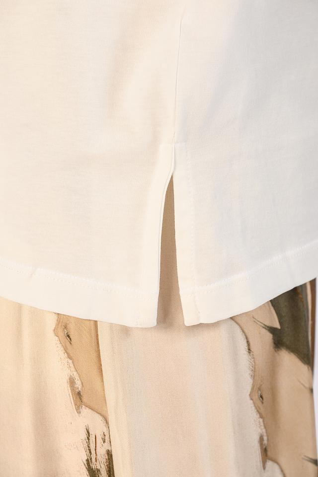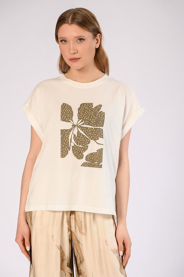 Оригинальный дизайн с золотистым декором добавляет образу изысканности и делает эту футболку ярким акцентом вашего стиля.