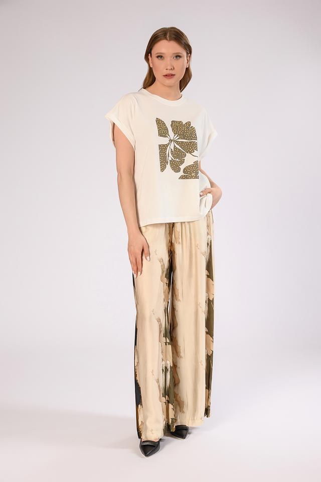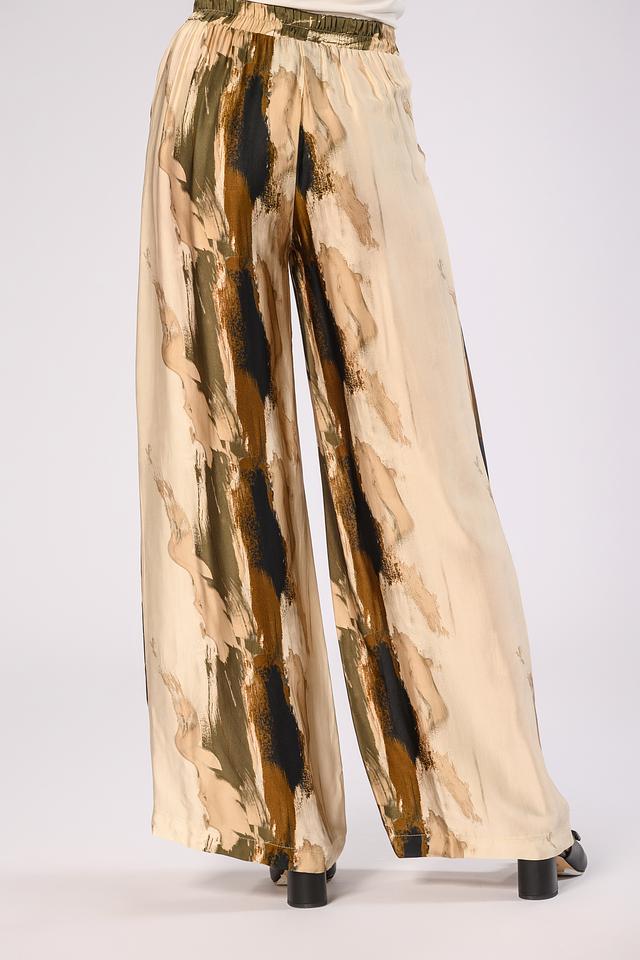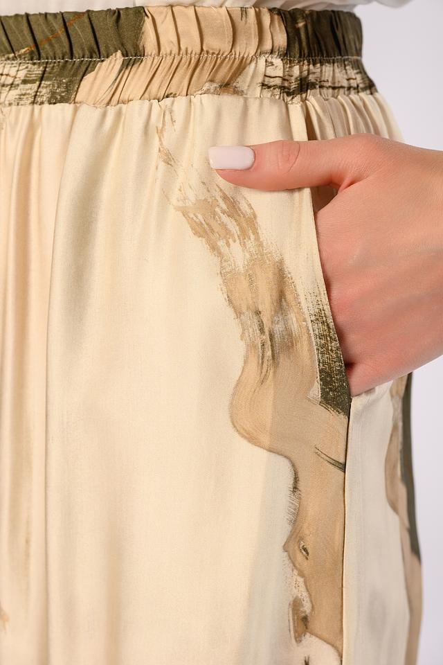 Особенностью модели является оригинальный принт в бежево-коричневой гамме, который добавляет брюкам изысканности и индивидуальности. Эластичный пояс обеспечивает комфортную посадку по фигуре.