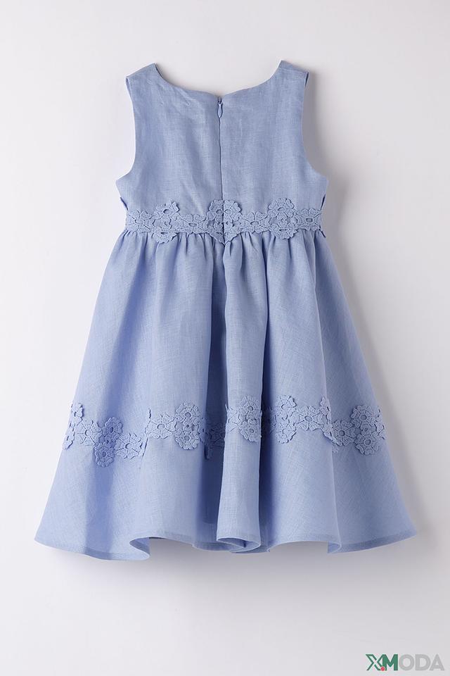 Платье имеет свободный крой, не сковывающий движений, и удобную круглую горловину. Декорировано нежным цветочным кружевом по лифу и нижней части юбки, что придает ему романтичный и нарядный вид. Застежка на спинке выполнена в виде потайной молнии.