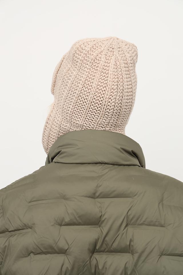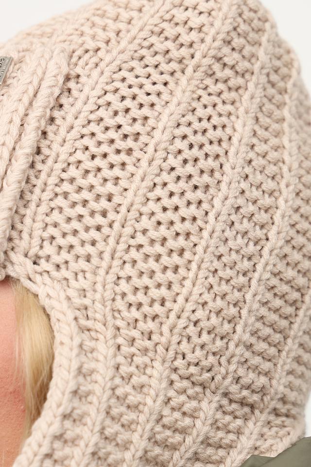 Вязаная шапка бежевого цвета выполнена из мягкого трикотажа, который приятно ощущается на коже и хорошо сохраняет тепло.