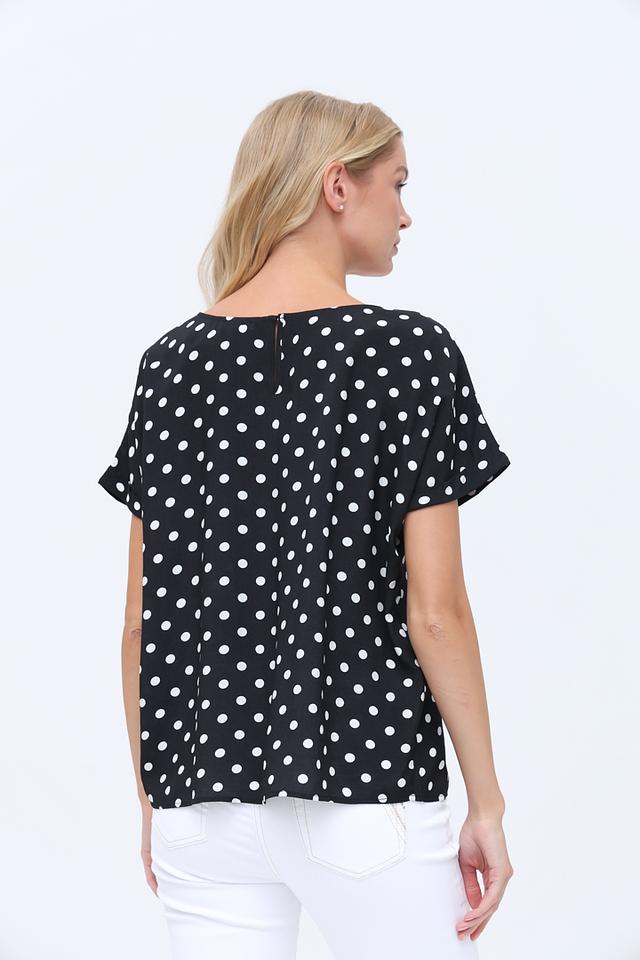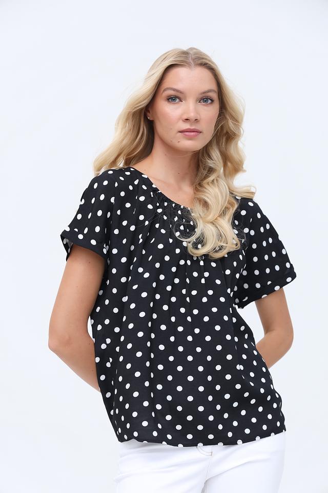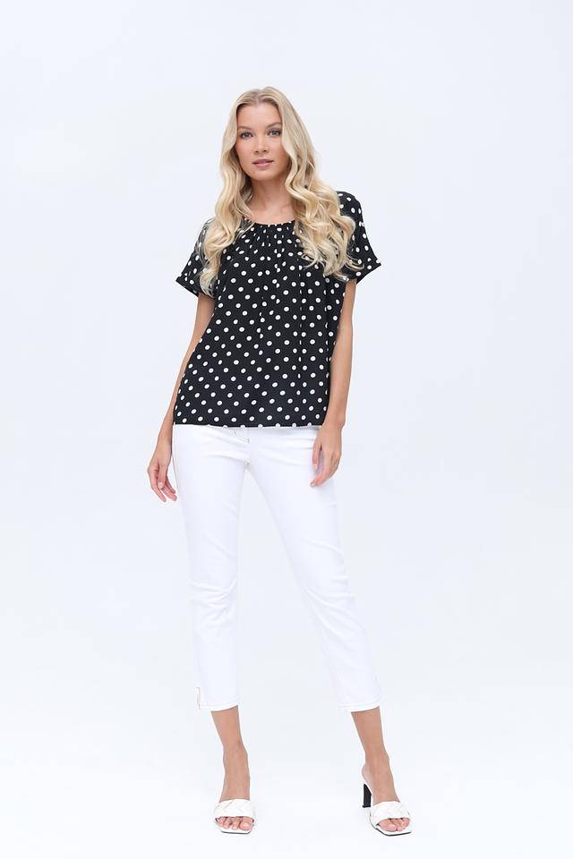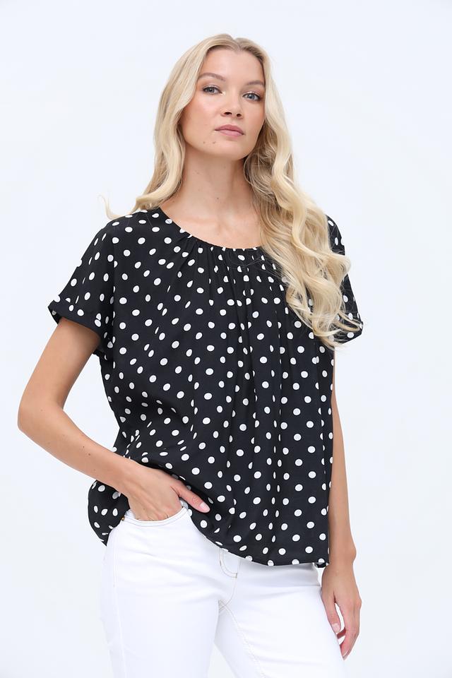 Блуза имеет классический чёрный цвет, украшенный мелким белым горошком, что придает ей игривый и женственный вид. Округлый вырез горловины и короткие рукава делают ее идеальной для теплой погоды.