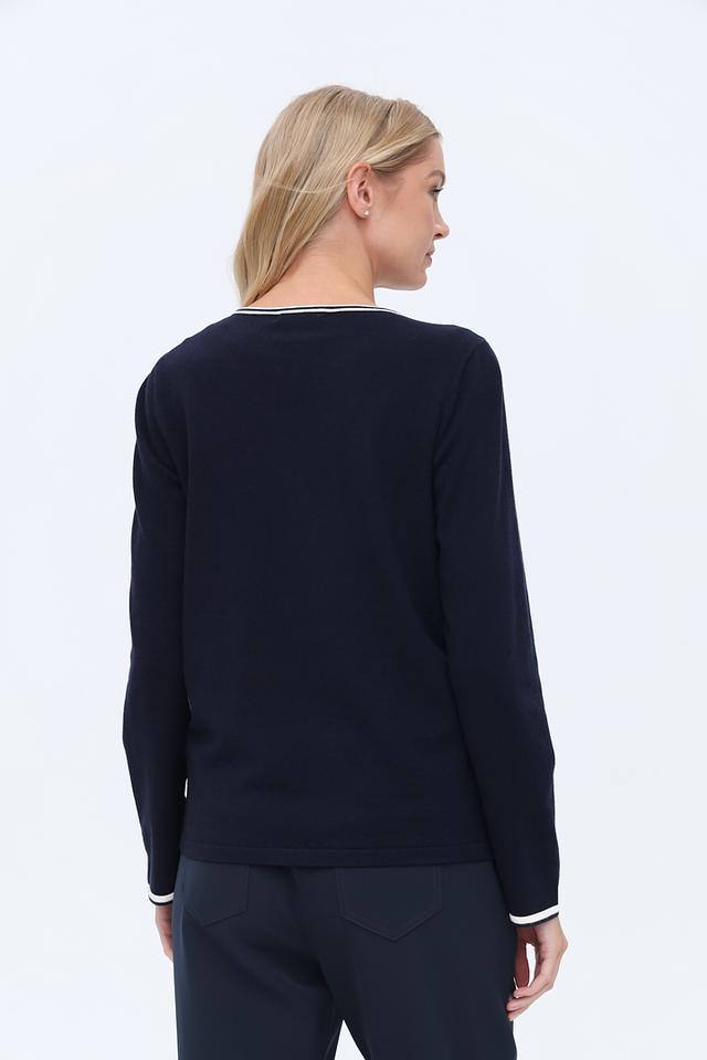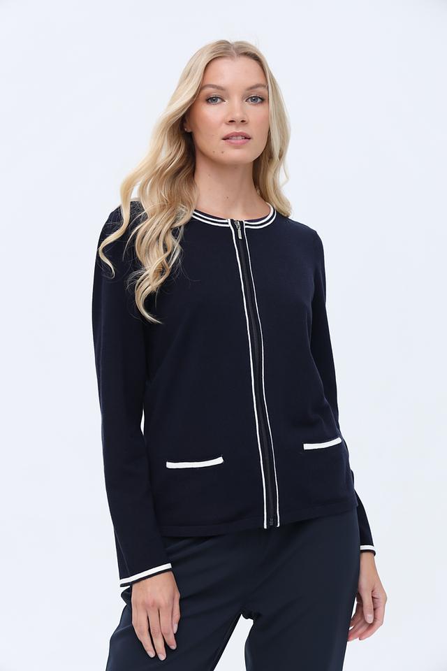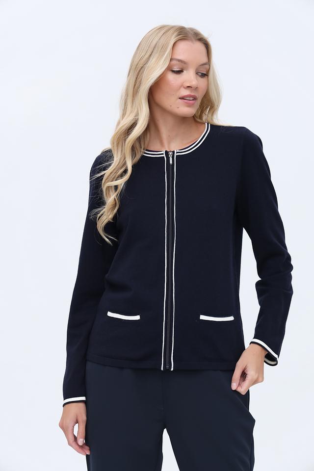 Жакет Just Valeri темно-синего цвета с контрастной белой отделкой на манжетах, карманах и по молнии. Модель на застежке-молнии с воротником-стойкой, идеально подходит для создания стильных повседневных образов. Состав: вискоза 51%, полиамид 25%, полиэстер 24%
