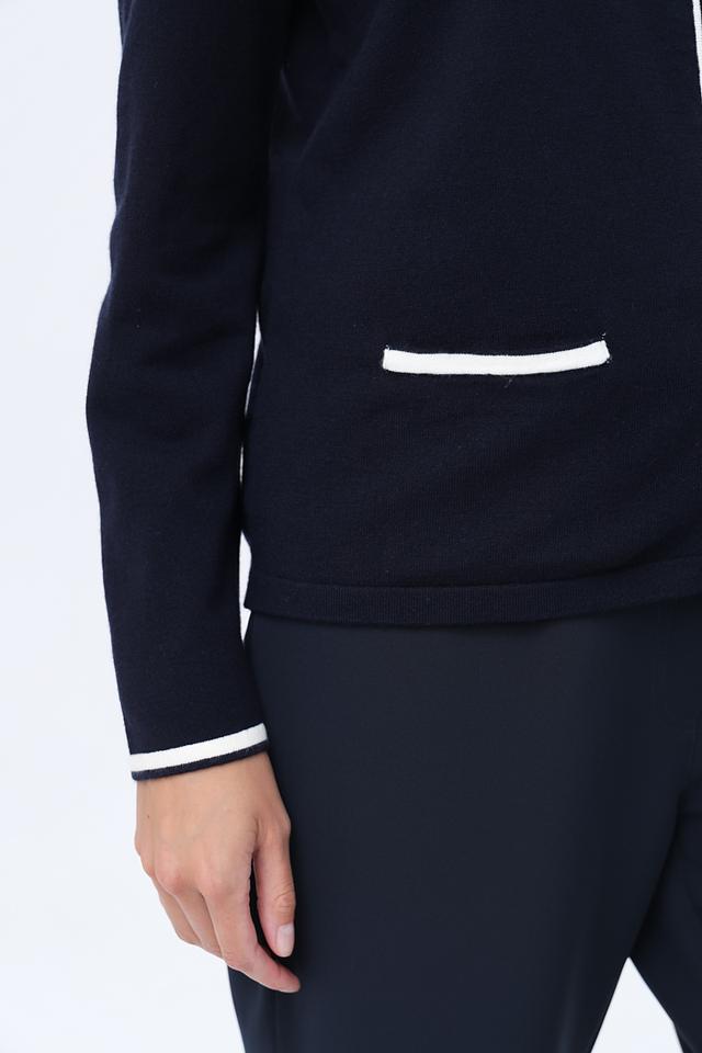 Жакет имеет прямую посадку, длинные рукава и застегивается на молнию. Воротник-стойка придает модели современный вид. Белая отделка на манжетах, карманах и вдоль молнии добавляет контраста и подчеркивает стиль.
