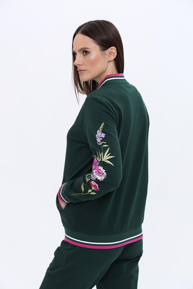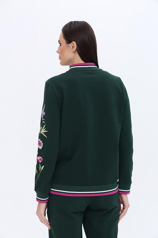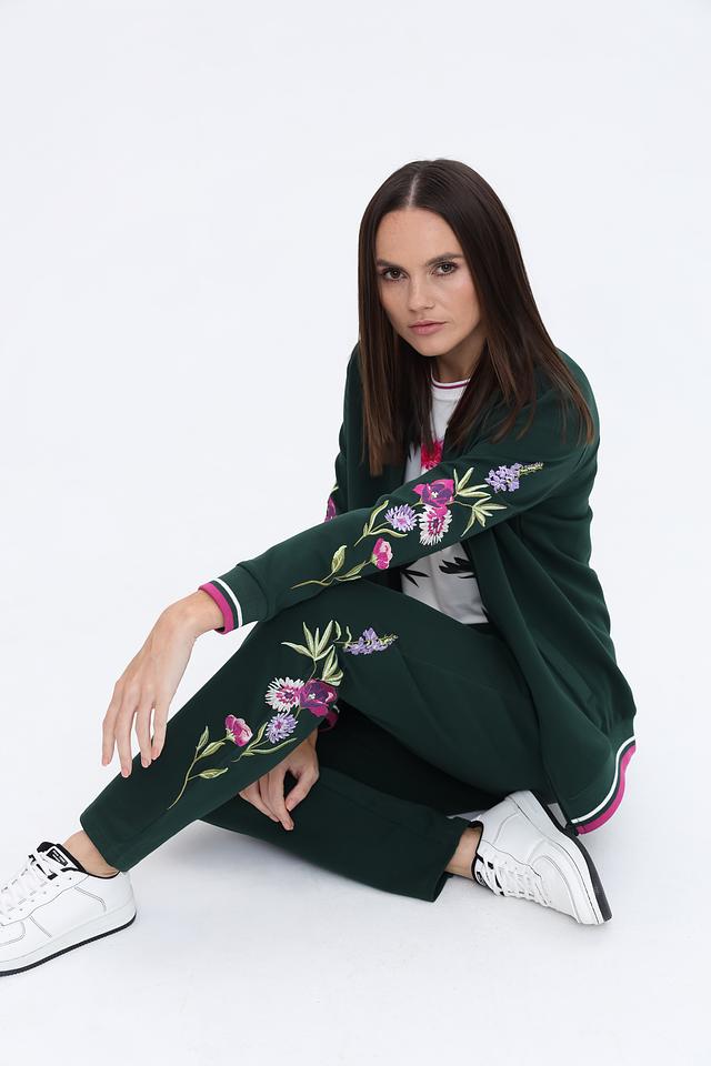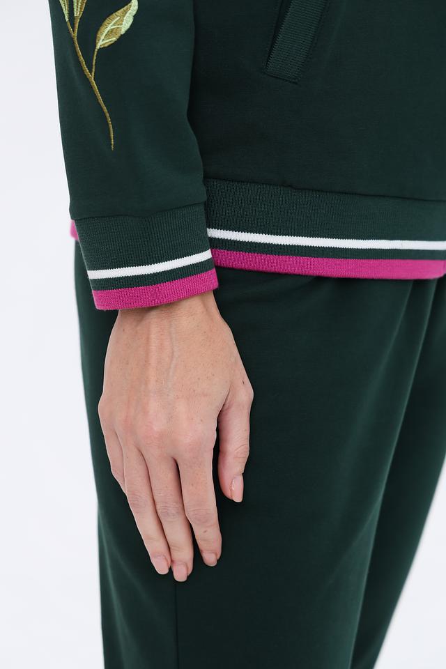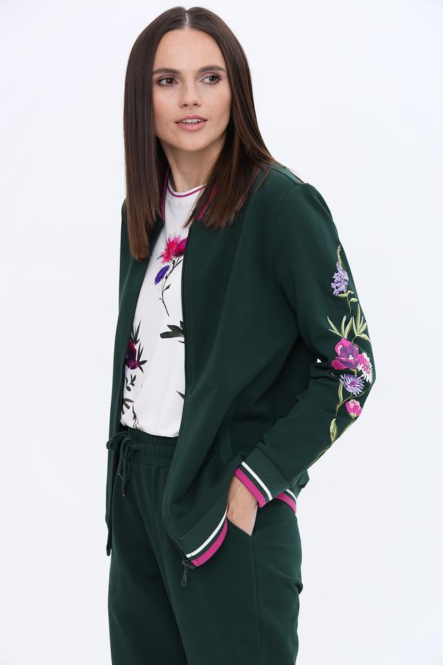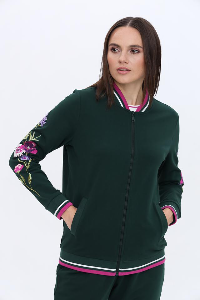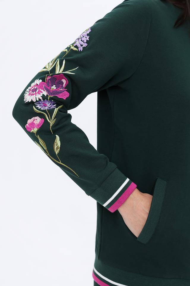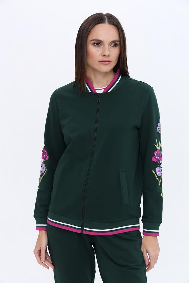 Эта женская толстовка от бренда Just Valeri выполнена в насыщенном зеленом цвете и украшена яркой цветочной вышивкой. Модель имеет удобную застежку-молнию и эластичные манжеты, отделанные розовым кантом, что придает ей особый шарм.