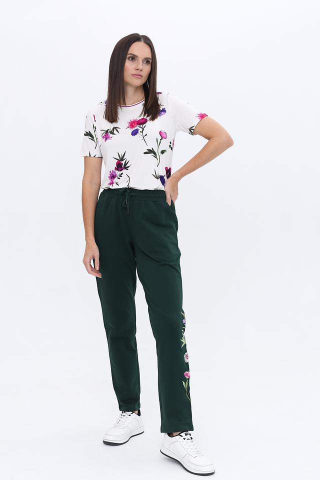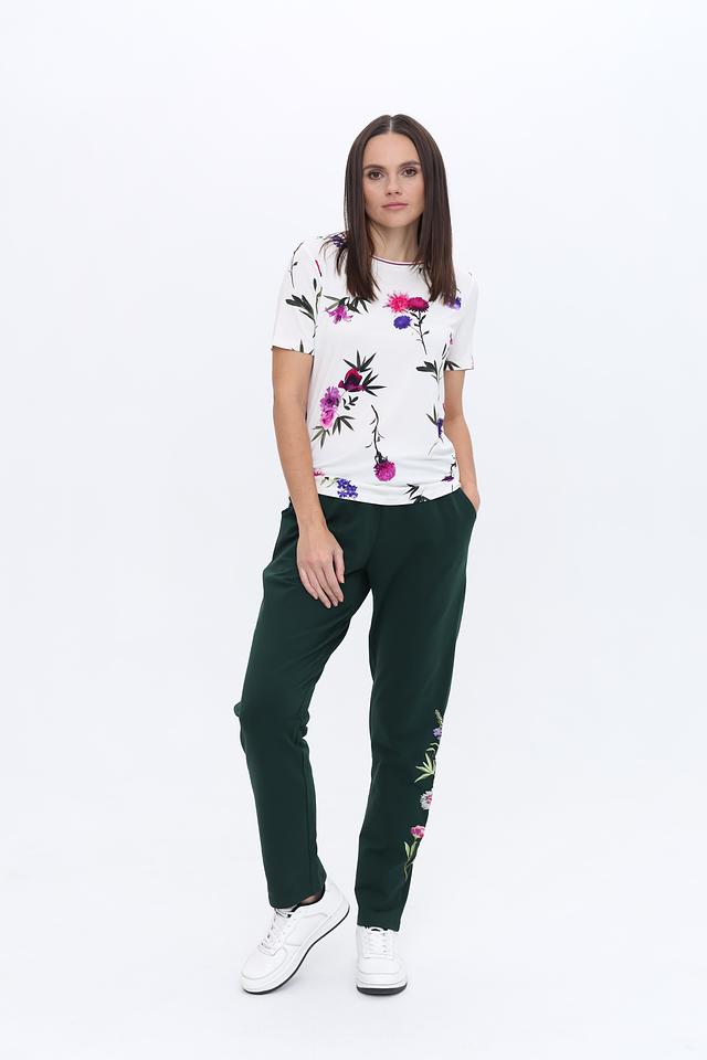 Модель имеет прямой крой и короткие рукава, что обеспечивает комфорт в жаркую погоду. Круглый вырез горловины дополнен тонкой окантовкой. Футболка изготовлена из высококачественной вискозы с добавлением эластана, благодаря чему она приятна к телу, хорошо драпируется и не мнется.