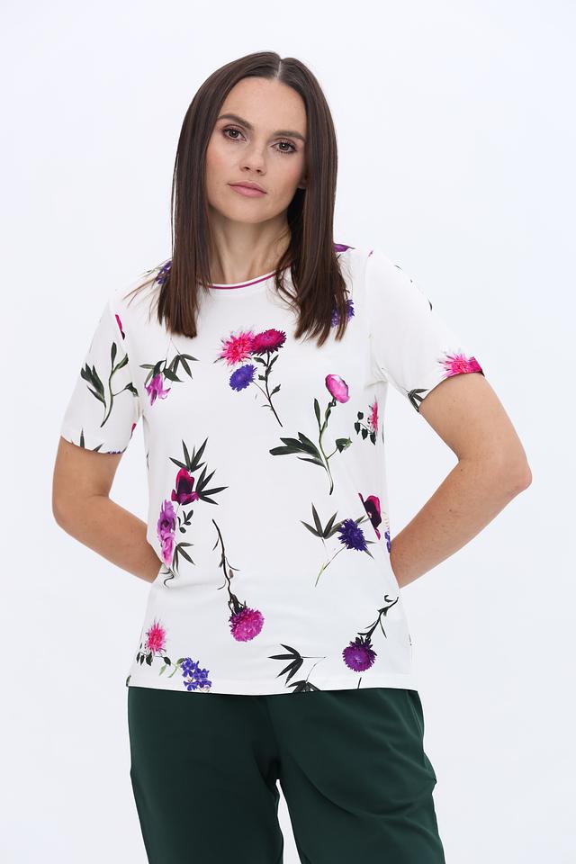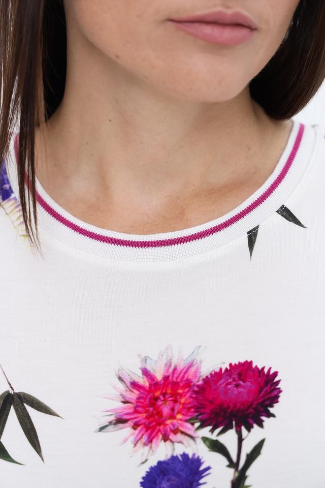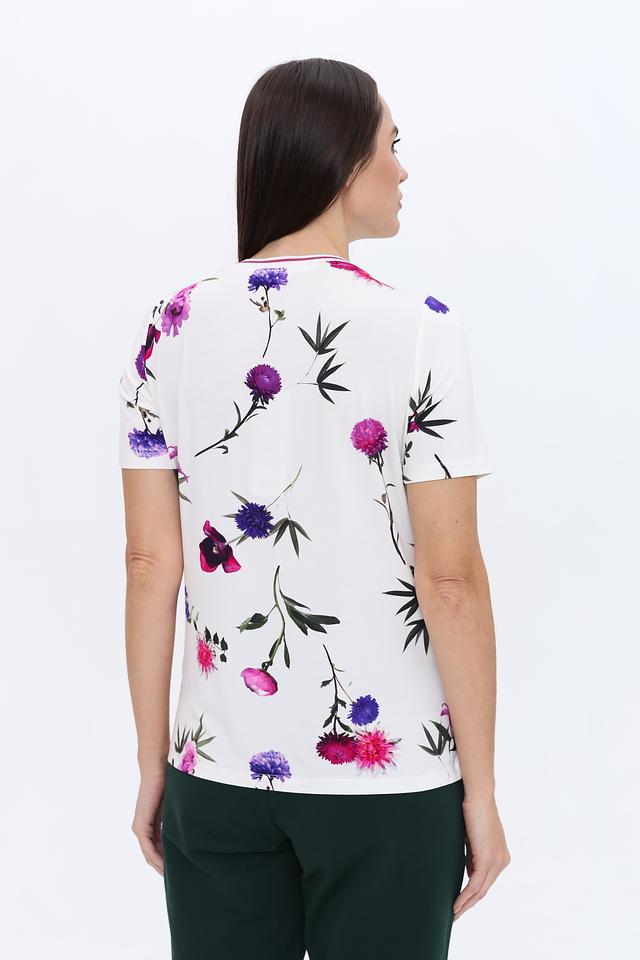 Эта стильная футболка от Just Valeri станет прекрасным выбором для создания повседневного образа. Футболка выполнена в белом цвете и украшена ярким, красочным цветочным принтом, который добавляет ей легкости и женственности.