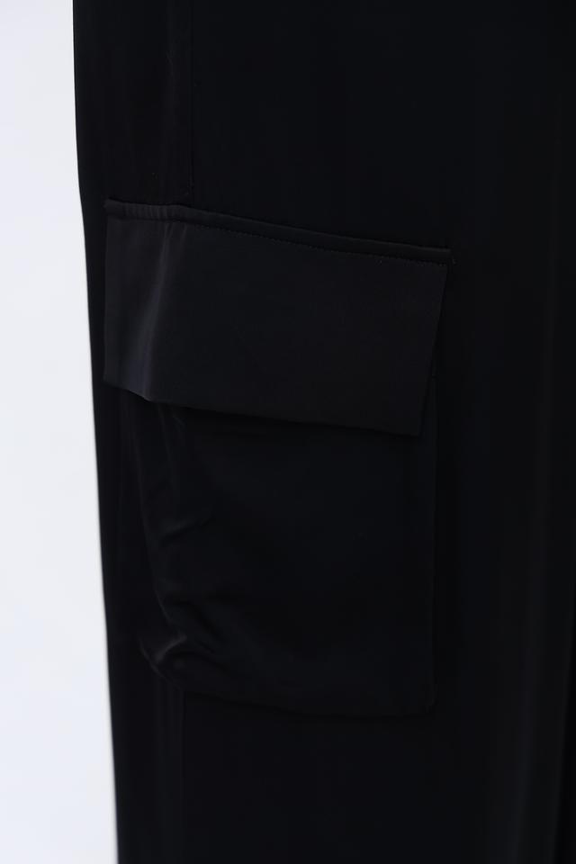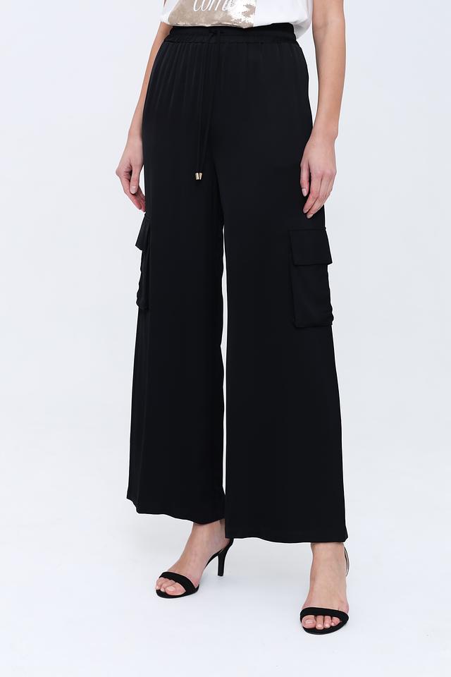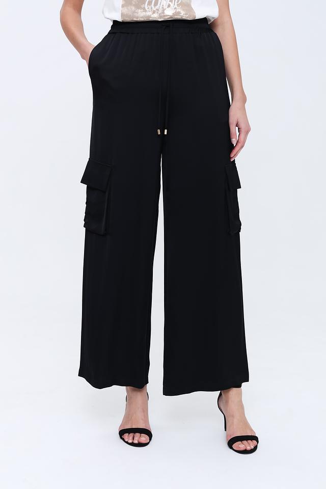 Брюки имеют завышенную талию, которая визуально удлиняет ноги и подчеркивает фигуру. Удобный пояс на кулиске обеспечивает комфортную посадку и позволяет регулировать обхват талии. По бокам брюк расположены функциональные карманы-карго, добавляющие образу практичности и динамики.