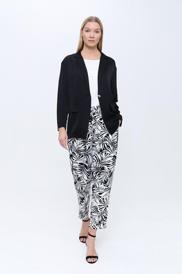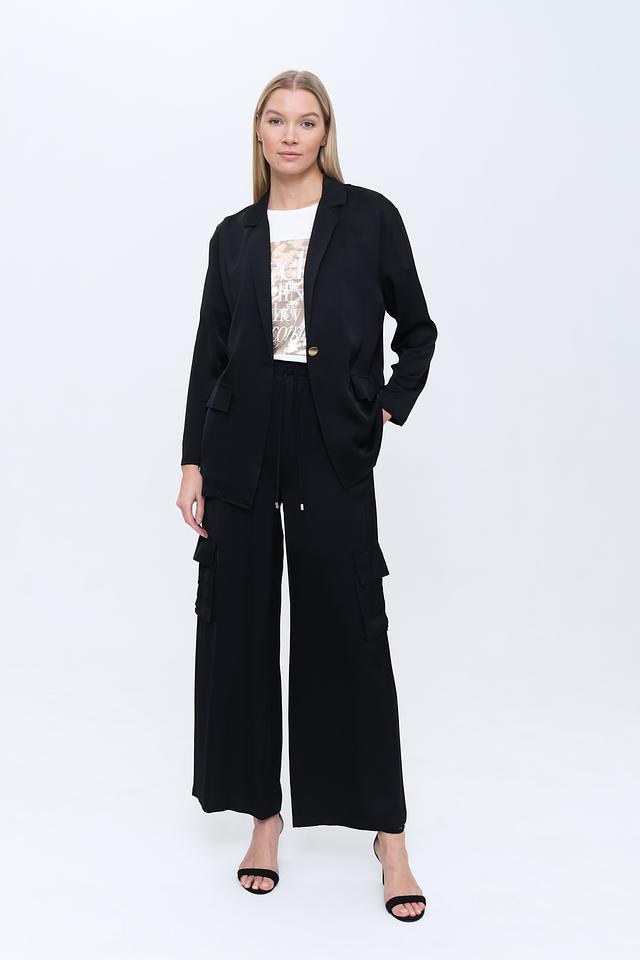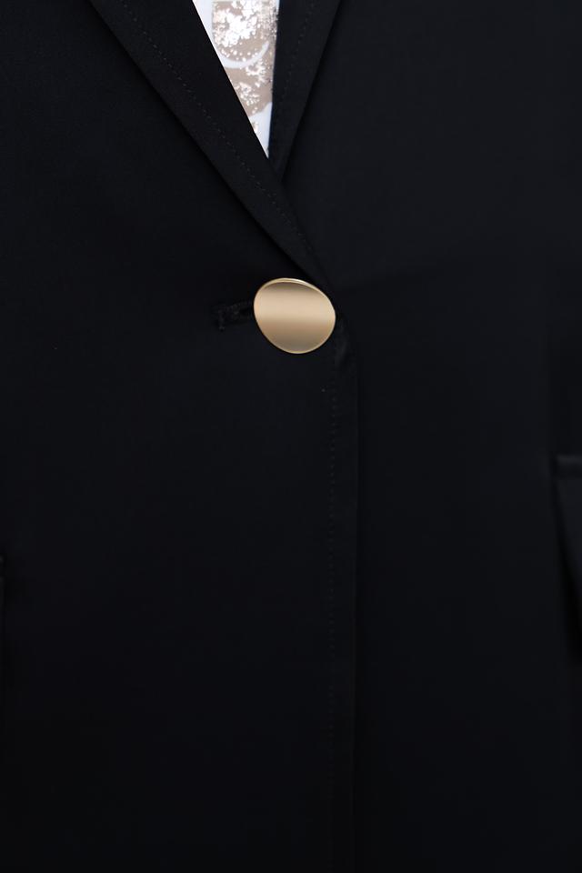 Модель имеет оверсайз крой, который обеспечивает комфорт и свободу движений. Лацканы добавляют жакету классический вид, а застежка на одну пуговицу позволяет регулировать силуэт.