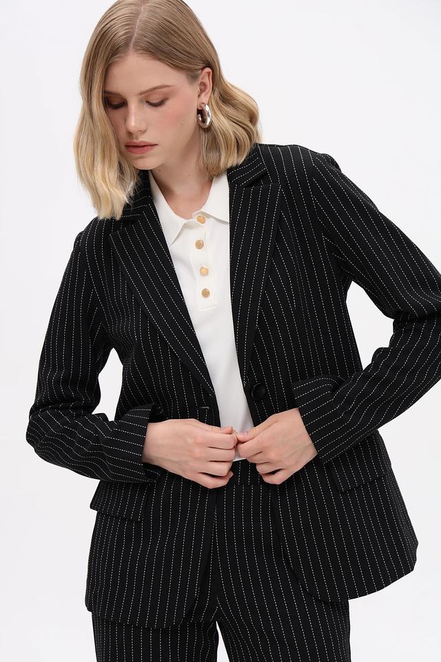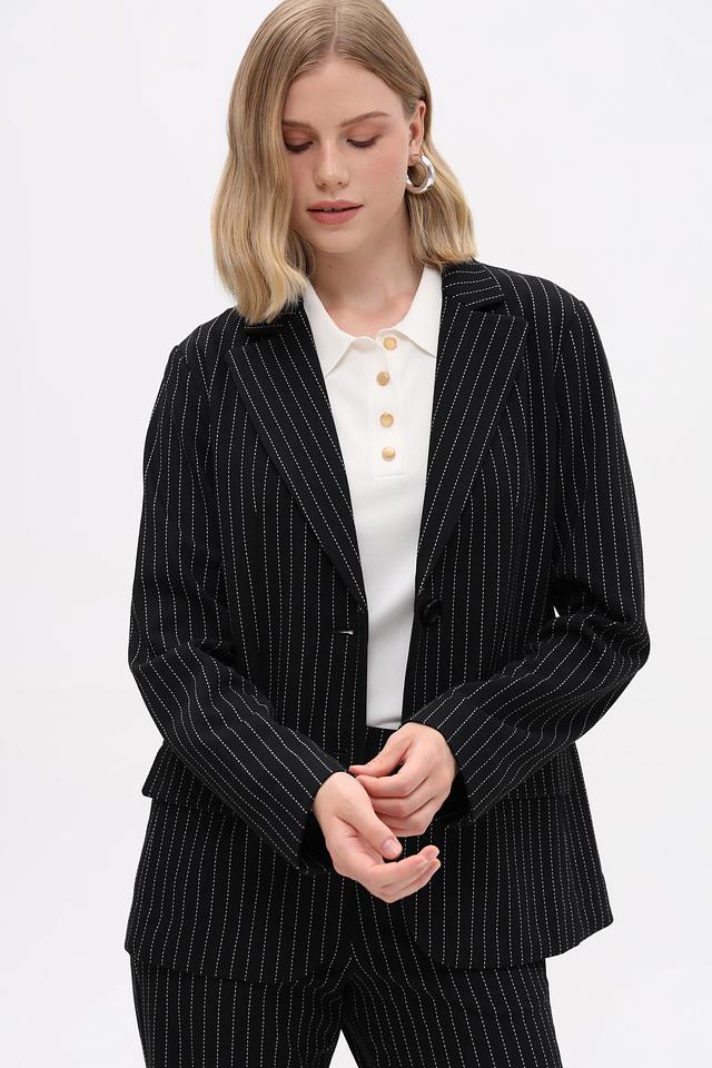 Жакет Just Valeri — это элегантный выбор для создания делового или повседневного образа. Модель выполнена в классическом чёрном цвете с вертикальной полоской, что визуально вытягивает силуэт.