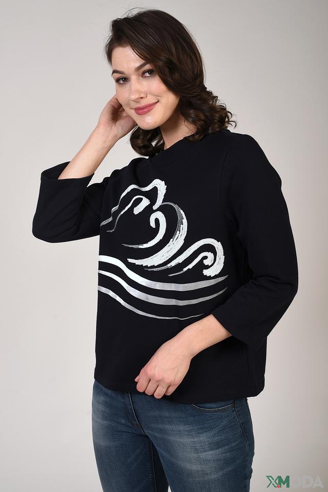 Этот стильный пуловер от бренда Just Valeri станет прекрасным дополнением к вашему гардеробу. Пуловер выполнен в классическом чёрном цвете и украшен эффектным принтом в виде волн, выполненным в серебристых тонах.