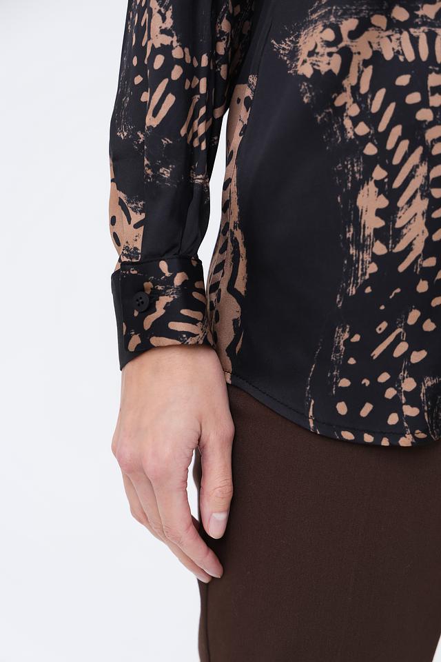 Блуза имеет свободный крой, длинные рукава и классический отложной воротник. Застёжка на пуговицах позволяет регулировать степень открытости. Привлекает внимание оригинальный принт, сочетающий в себе абстрактные мотивы в бежево-коричневой гамме на чёрном фоне.
