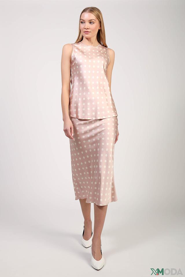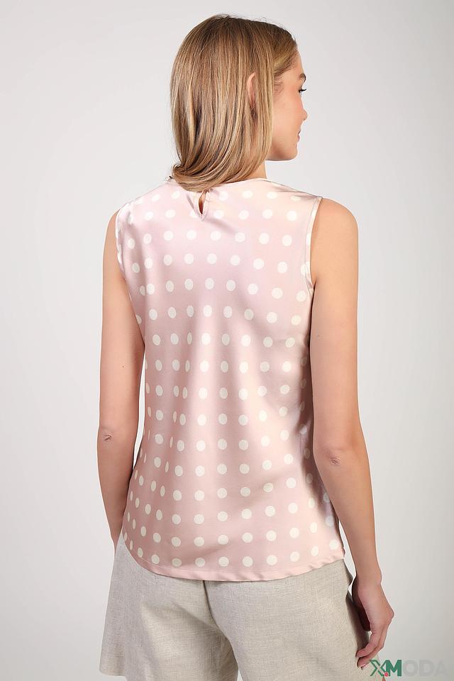 Блуза имеет нежный розовый цвет, украшенный мелким белым горошком, что придает ей игривый и романтичный вид. Округлый вырез горловины и отсутствие рукавов делают ее идеальным выбором для теплой погоды.
